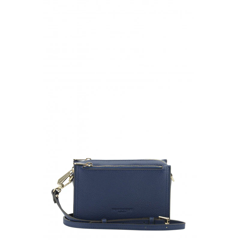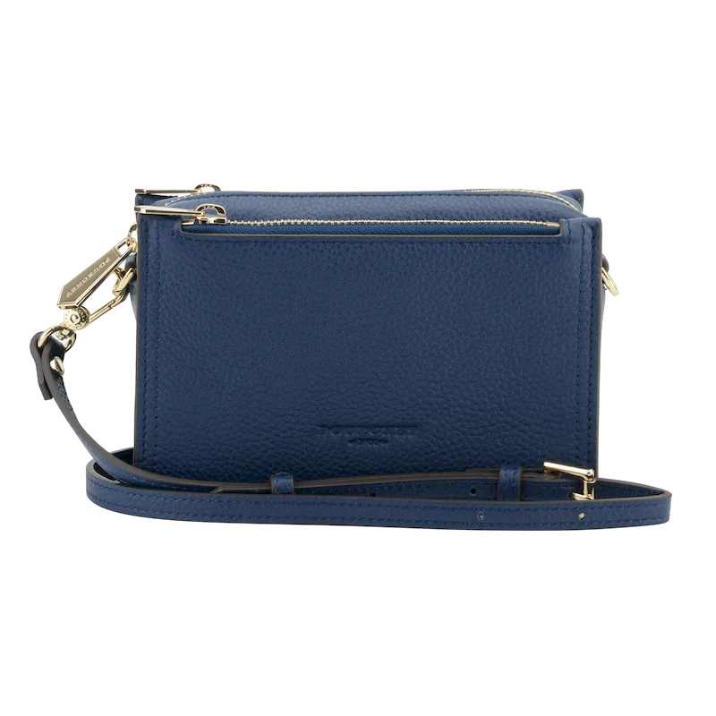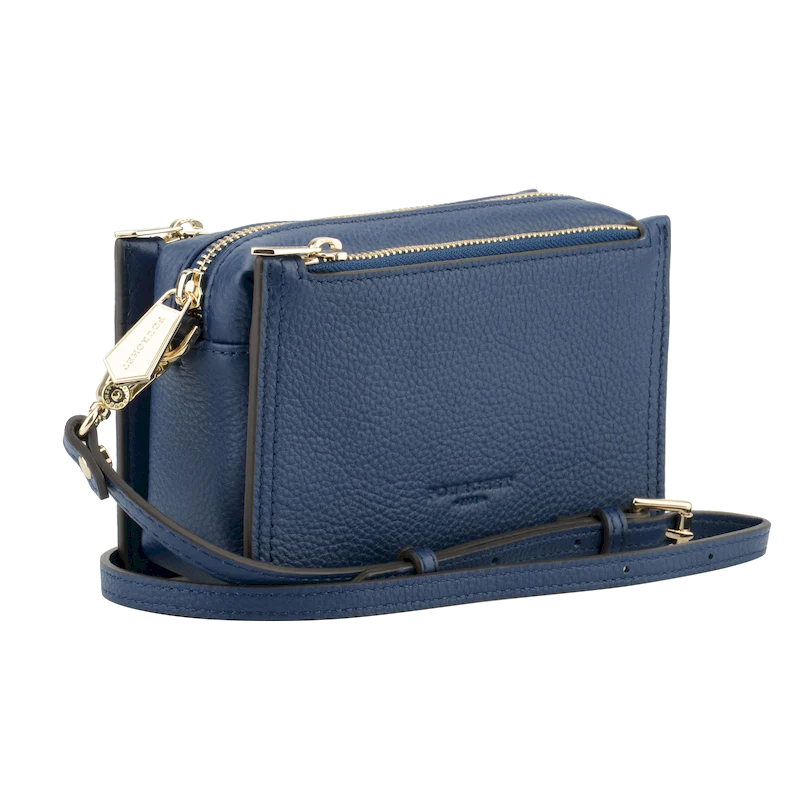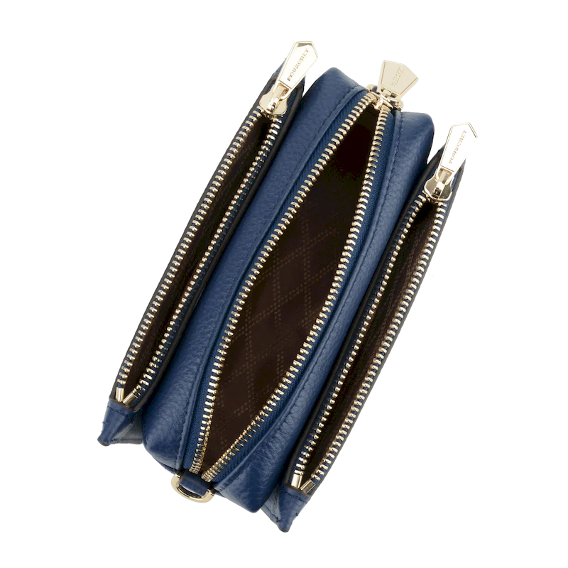 Ce modèle présente une forme rectangulaire avec des lignes épurées, ce qui lui confère un style moderne et raffiné. Les fermetures éclair dorées ajoutent une touche de luxe, contrastant harmonieusement avec le cuir bleu marine profond.