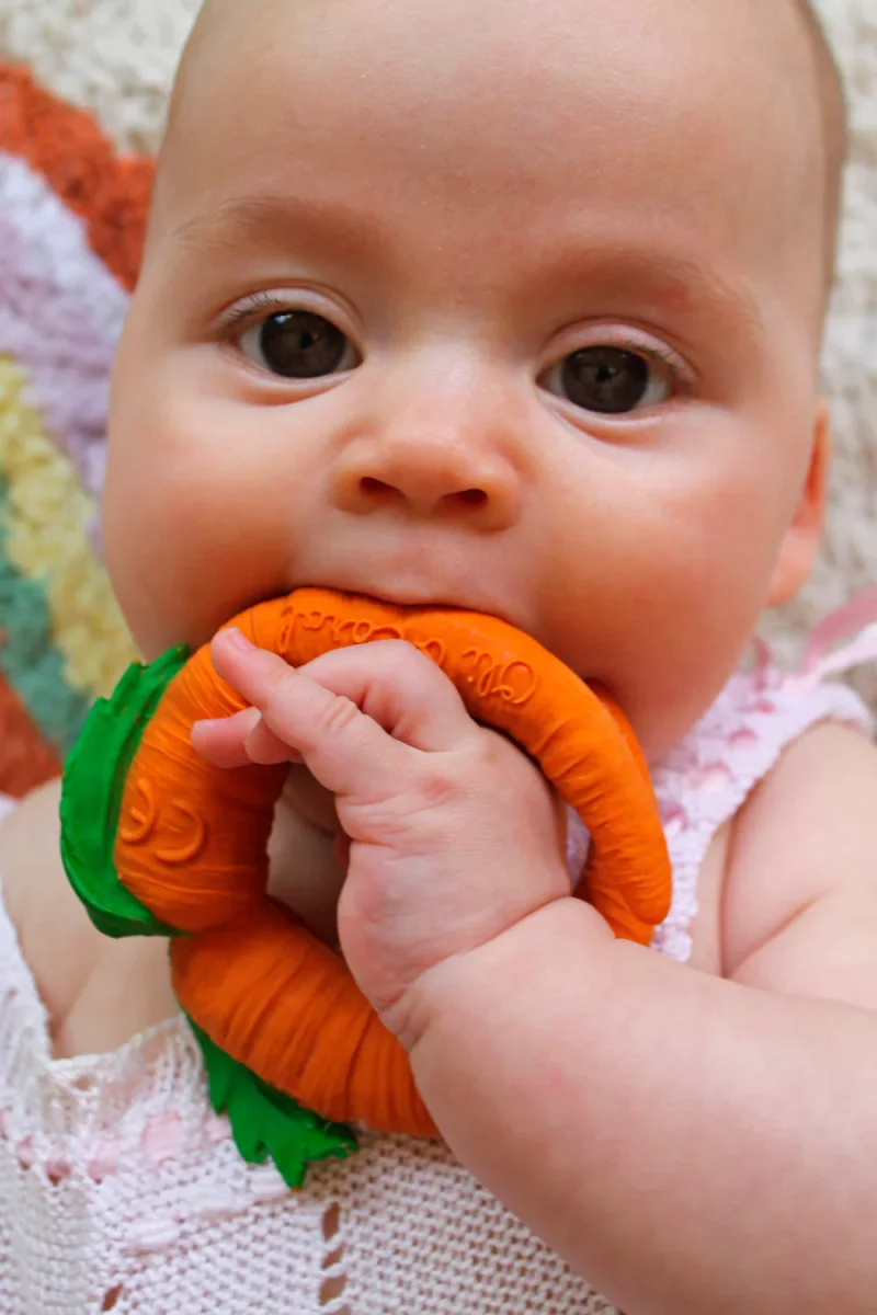 Cette jolie carotte en forme de bracelet de dentition soulagera à tout moment les gencives de bébé.