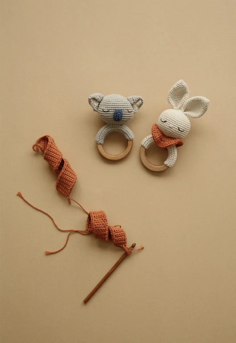 Ce jouet est crocheté à la main en coton bio. L’anneau est en bois d’érable.