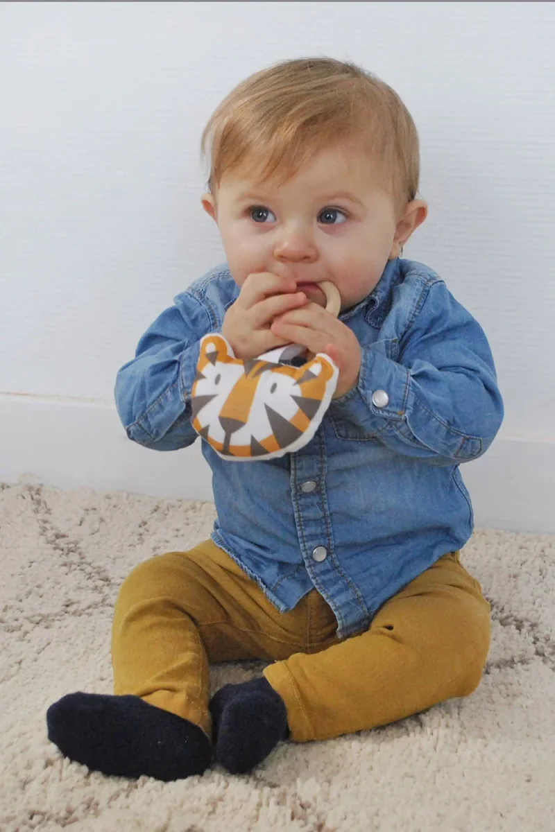Aie aie aie, difficile de voir nos petits bouts souffrir à cause des poussées dentaires… Heureusement, l’anneau de dentition bois et tissu est là pour le soulager. Avec son anneau en bois de hêtre non traité, bébé pourra mordiller jusqu’à soulagement sans risque d’ingérer des substances nocives. Les matériaux sont sélectionnés avec soin, sans substance nocives, pour garantir tout le confort nécessaire à bébé.