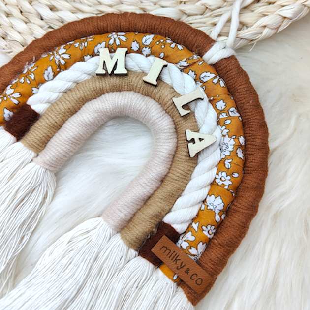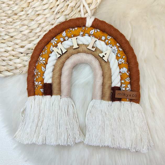 Cet arc-en-ciel à suspendre est une décoration idéale pour chambre d’enfant ou pour habiller les murs de sa chambre. Parfait également pour compléter un coffret naissance. Personnalisé avec le prénom ou mot de votre choix (maximum 10 caractères). Lettres en bois. Petit cordon pour le suspendre. Dimensions : 15 cm X 15 cm
