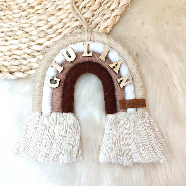Cet arc-en-ciel à suspendre est une décoration idéale pour chambre d’enfant ou pour habiller les murs de sa chambre. Parfait également pour compléter un coffret naissance. Personnalisé avec le prénom ou mot de votre choix (maximum 9 caractères). Lettres en bois. Petit cordon pour le suspendre. Dimensions : 15 cm X 15 cm