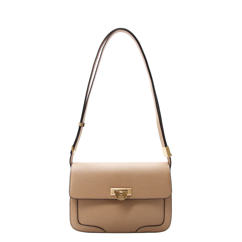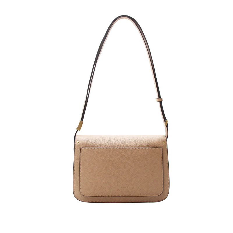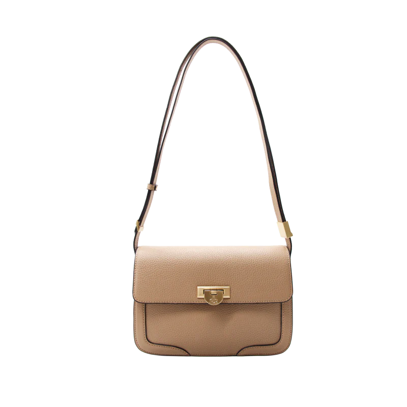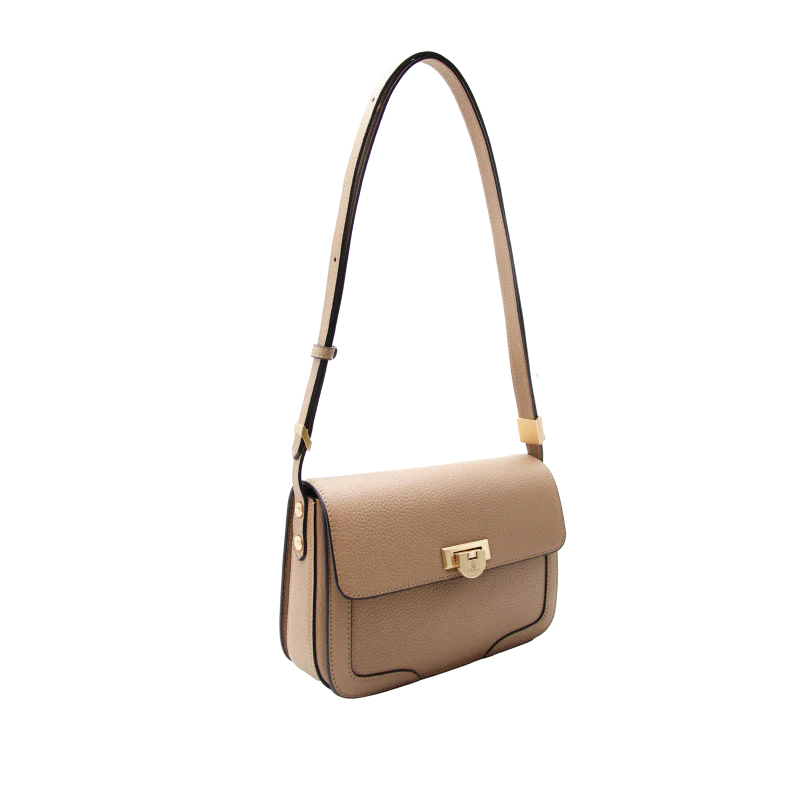 Ce sac à bandoulière présente une forme rectangulaire avec des lignes épurées et un design contemporain. Il est équipé d’une fermeture à rabat ornée d’un fermoir doré, apportant une touche de luxe à l’ensemble.