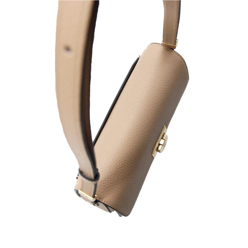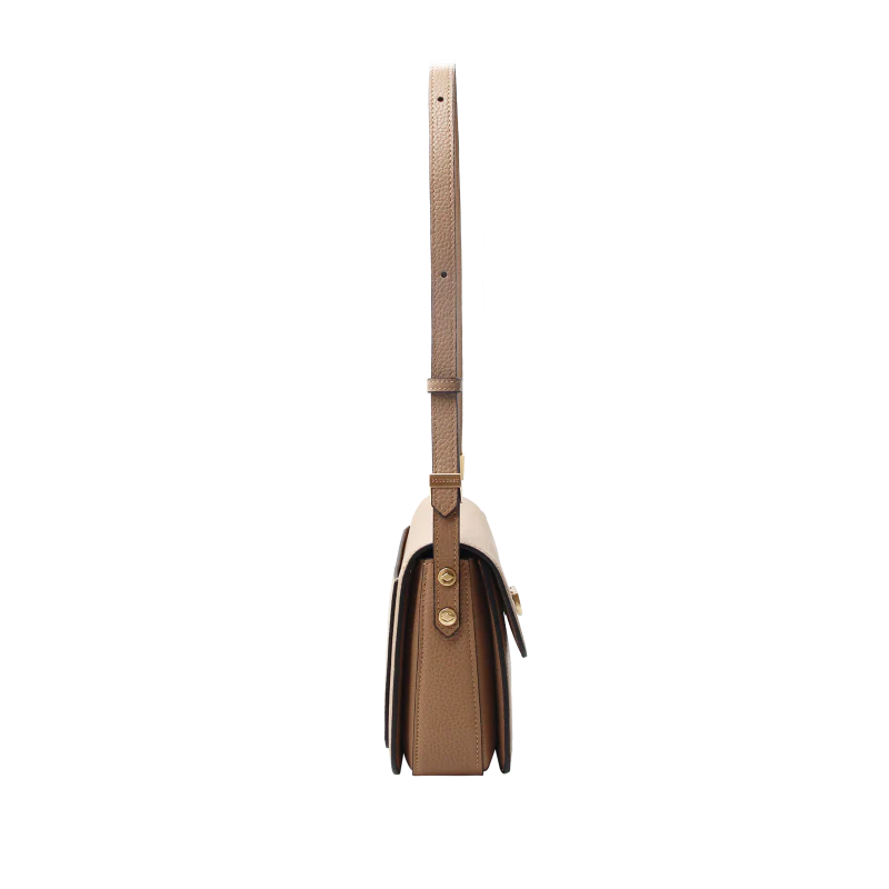 La bandoulière ajustable permet de le porter de différentes manières, que ce soit en travers du corps ou sur l’épaule. Cette anse, également en cuir, est rehaussée d’accents dorés qui complètent parfaitement le design du sac.