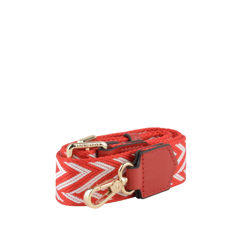 La bandoulière motif chevron rouge est un accessoire incontournable pour celles qui souhaitent allier style et praticité. Fabriquée en coton garni cuir, elle se distingue par son motif dynamique en chevron, rehaussé de lignes blanches qui créent un contraste saisissant avec le fond rouge.