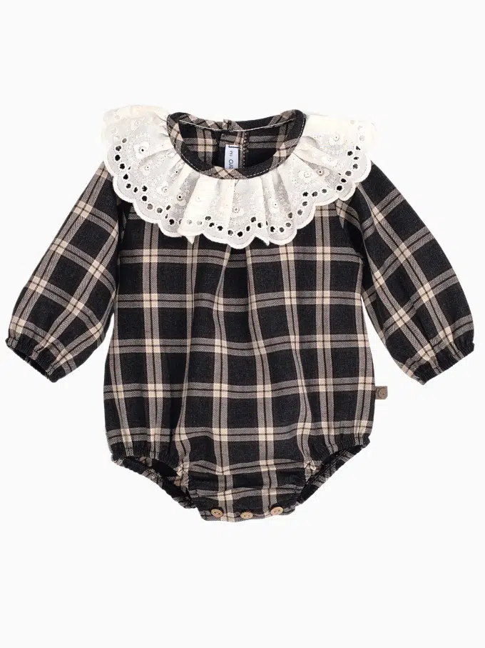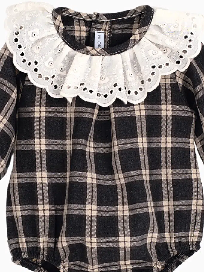 Barboteuse bébé fille carreaux et collerette brodée – Gris
