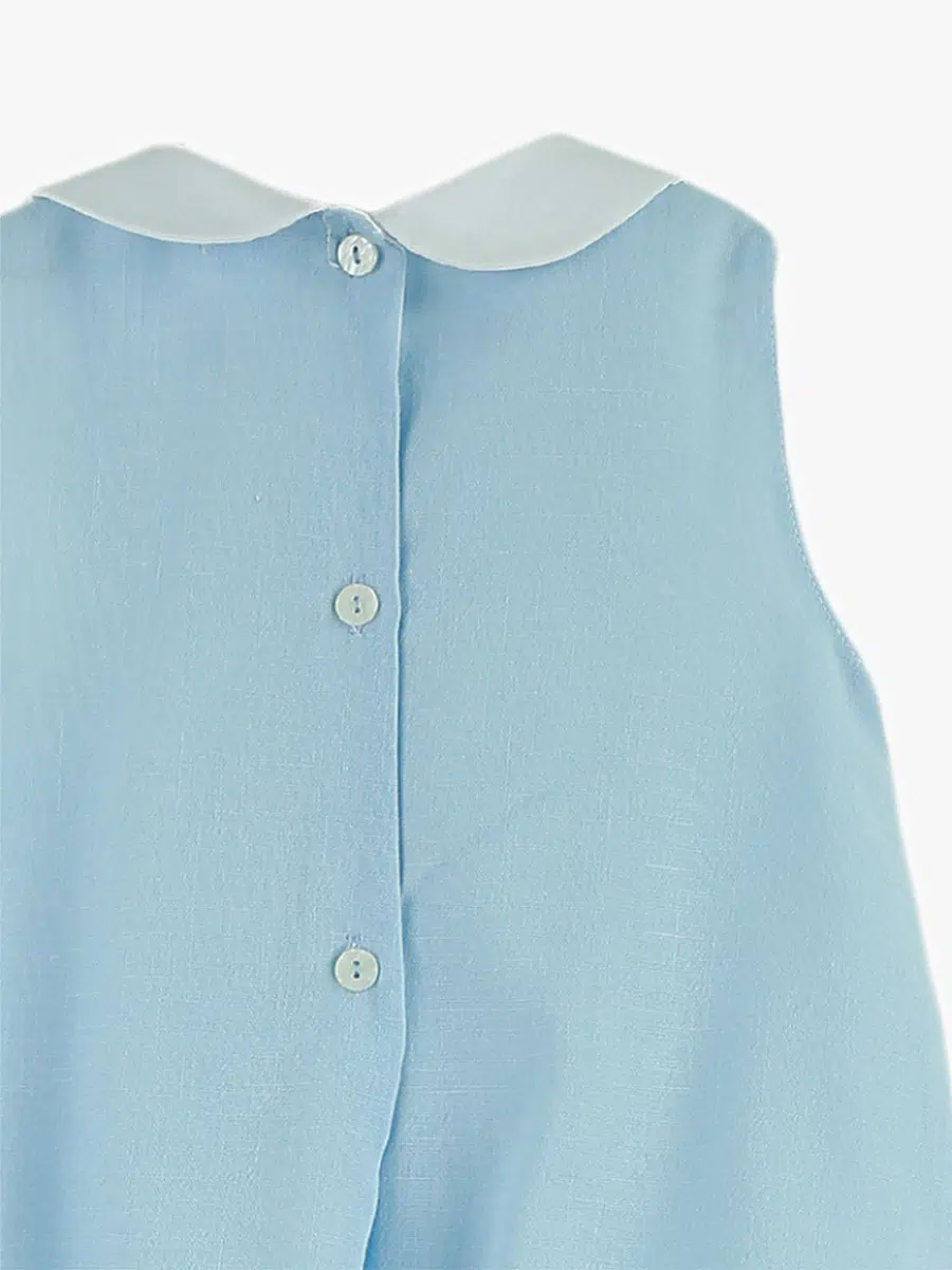 Le col rond blanc ajoute une touche de simplicité élégante qui sublime cette pièce estivale. Sa coupe sans manches assure une liberté de mouvement totale pour votre bébé, lui permettant de découvrir le monde avec aisance et confort.