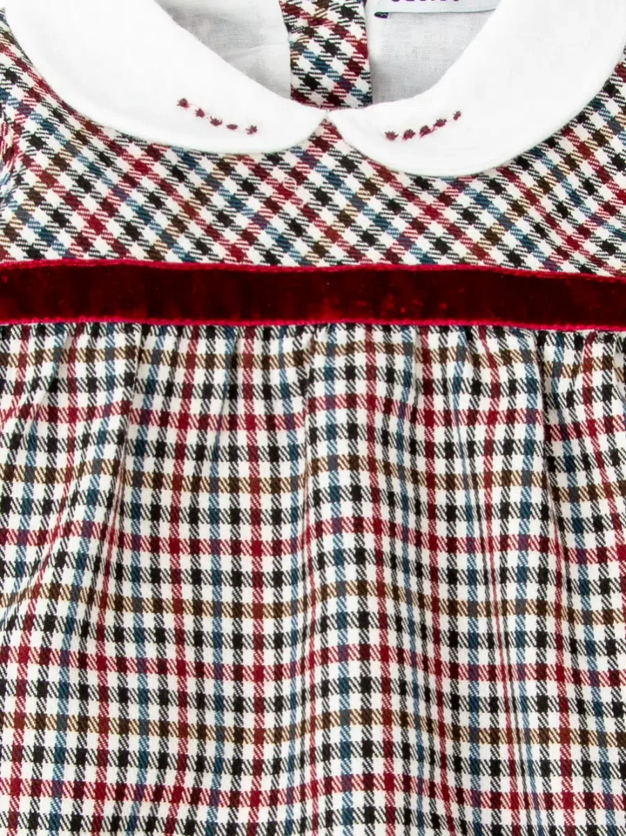 Fabriquée avec soin pour assurer une qualité supérieure, cette barboteuse est dotée de boutons à l’entrejambe pour un habillage et un déshabillage faciles. Sa coupe délicate et ses finitions impeccables en font une pièce essentielle dans la garde-robe de votre petite fille. Parfaite pour les saisons plus fraîches, elle ajoute une touche de sophistication avec ses carreaux rouges et son détail en velours, créant un look à la fois traditionnel et authentique.