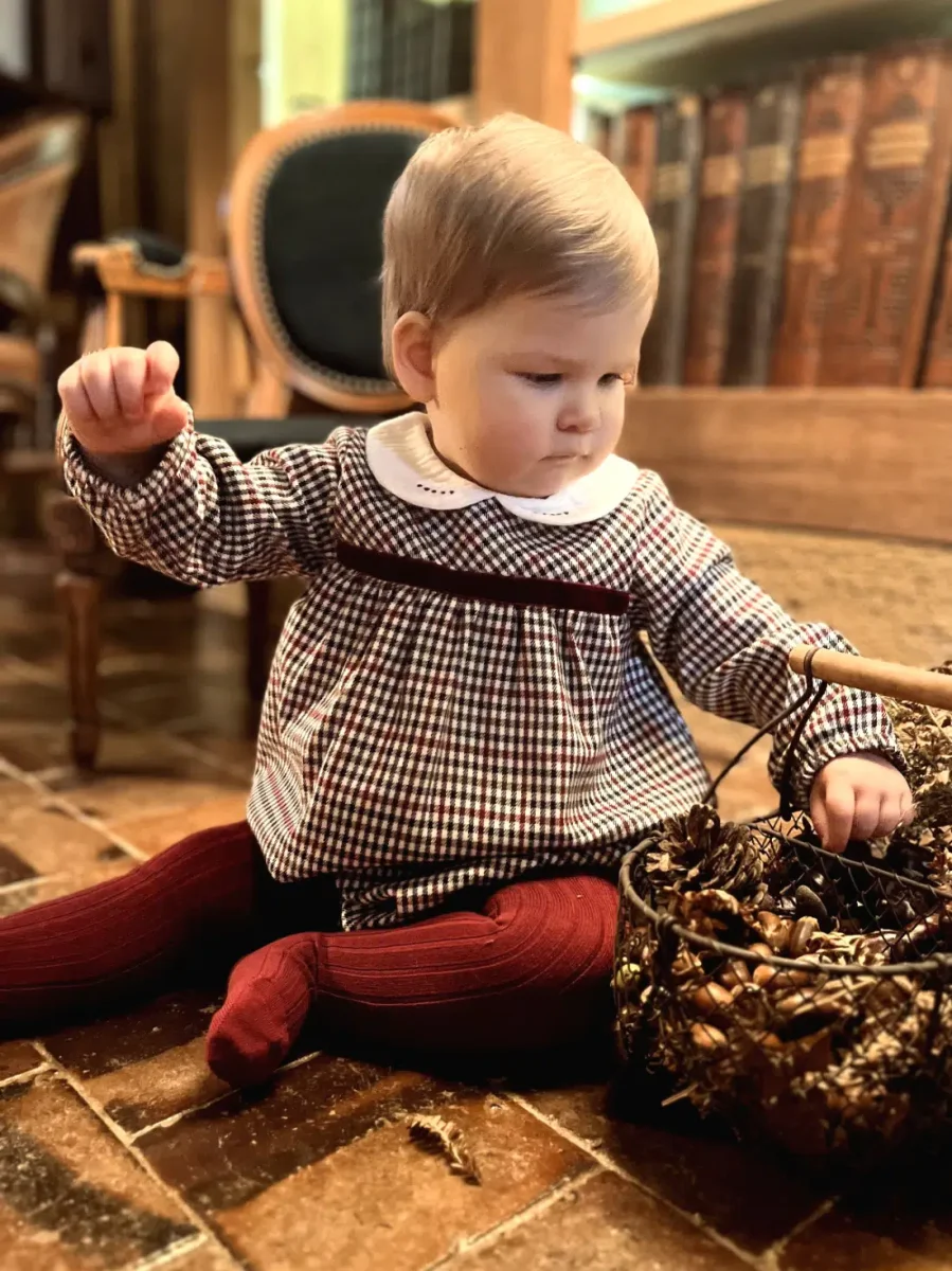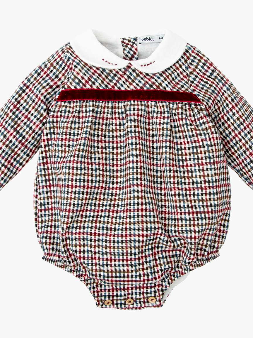 Découvrez la barboteuse bébé à petits carreaux tartan, un choix élégant et intemporel pour votre petite fille. Avec ses tons de rouge foncé et son détail en velours rouge foncé sur le devant, cette barboteuse incarne le charme classique et unique à la fois. Idéale pour les occasions spéciales ou le quotidien, elle allie confort et style avec un col rond blanc et des manches longues qui offrent chaleur et douceur.