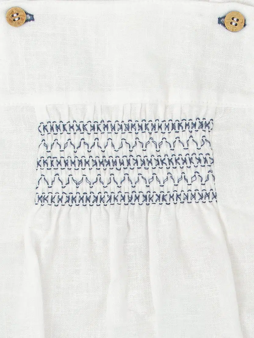 Les smocks bleu marine réalisés sur le devant structurent la silhouette tout en apportant une touche traditionnelle pleine de charme. Ce travail minutieux crée un joli contraste avec le blanc lumineux de la barboteuse, sans alourdir l’ensemble.
