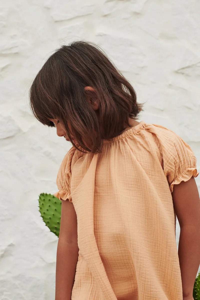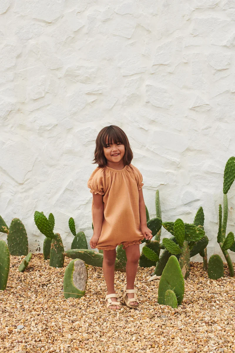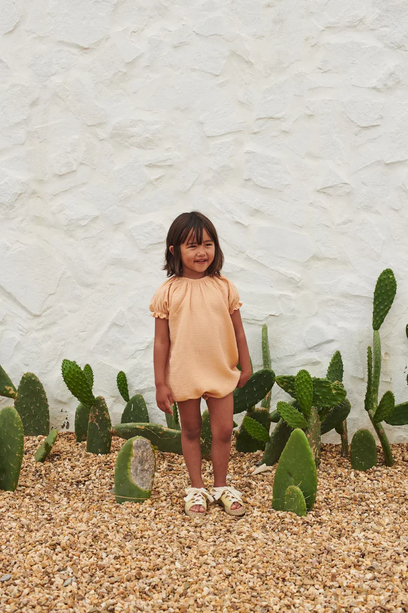 La barboteuse Emma présente une coupe large. Au niveau du col, des cuisses et des bras, le tissu est resserré avec un élastique. L’entrejambe est maintenue par des boutons pressions qui faciliteront le change.