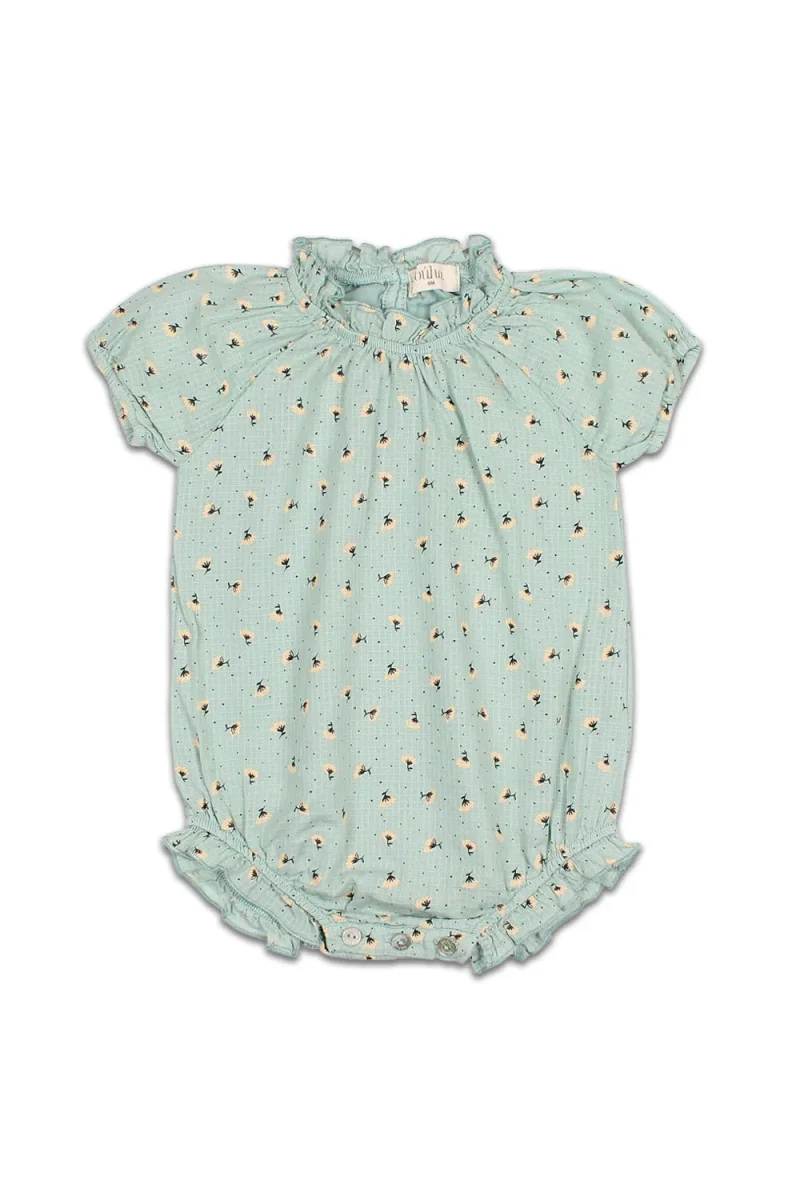 Grenouillère sans manches imprimé printemps. Encolure et cuisses à volants. Boutons à l’entrejambe pour un change facile. Élastiques sur l’encolure, les cuisses et les manches. Confortable.