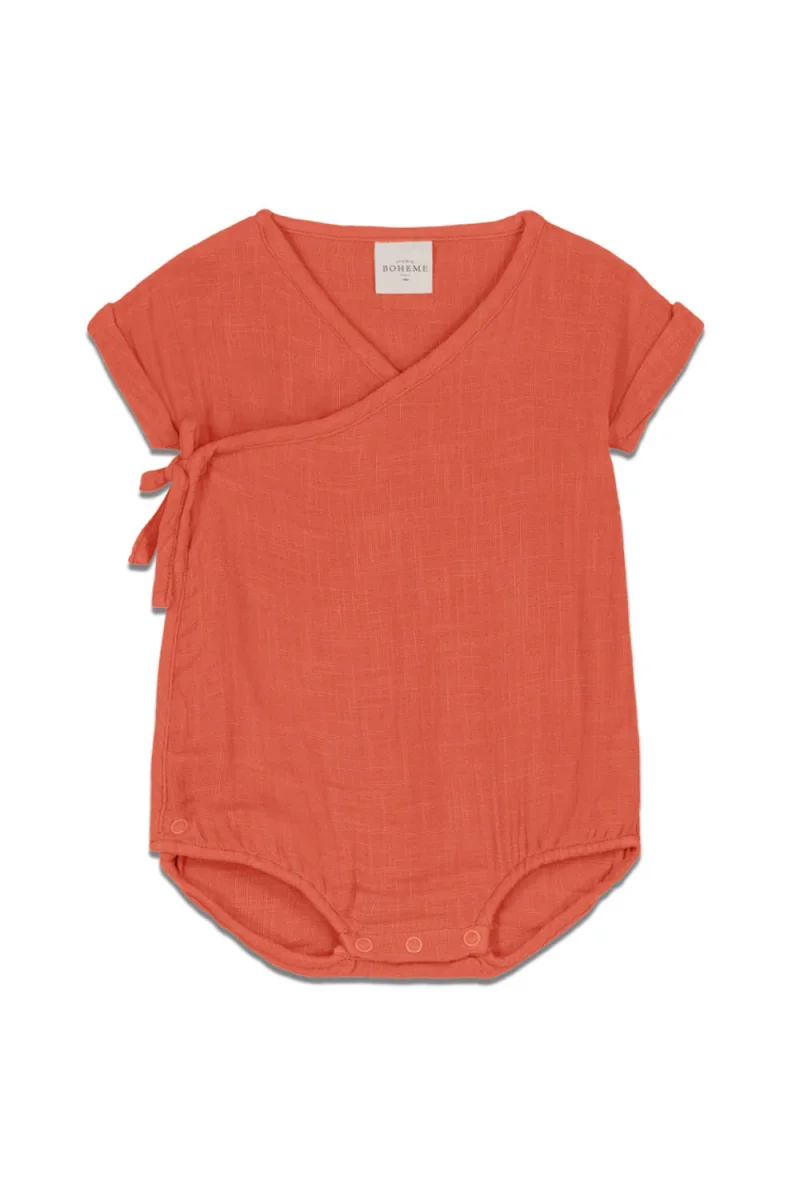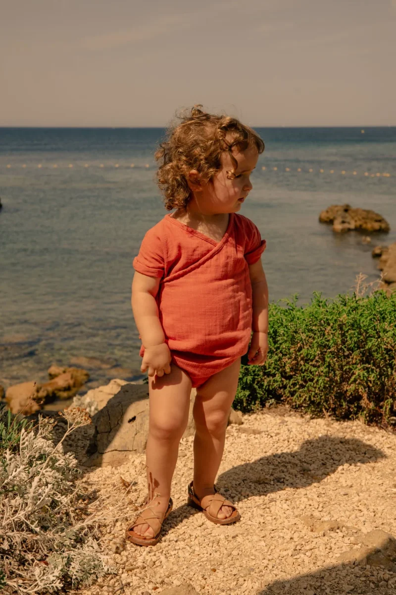 Barboteuse mixte forme Kimono de couleur orange brulé, en gaze de coton flammé biologique.