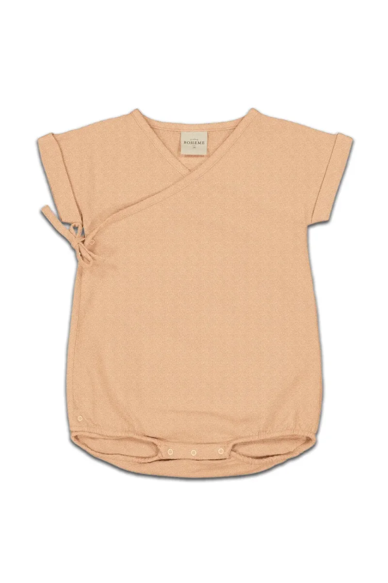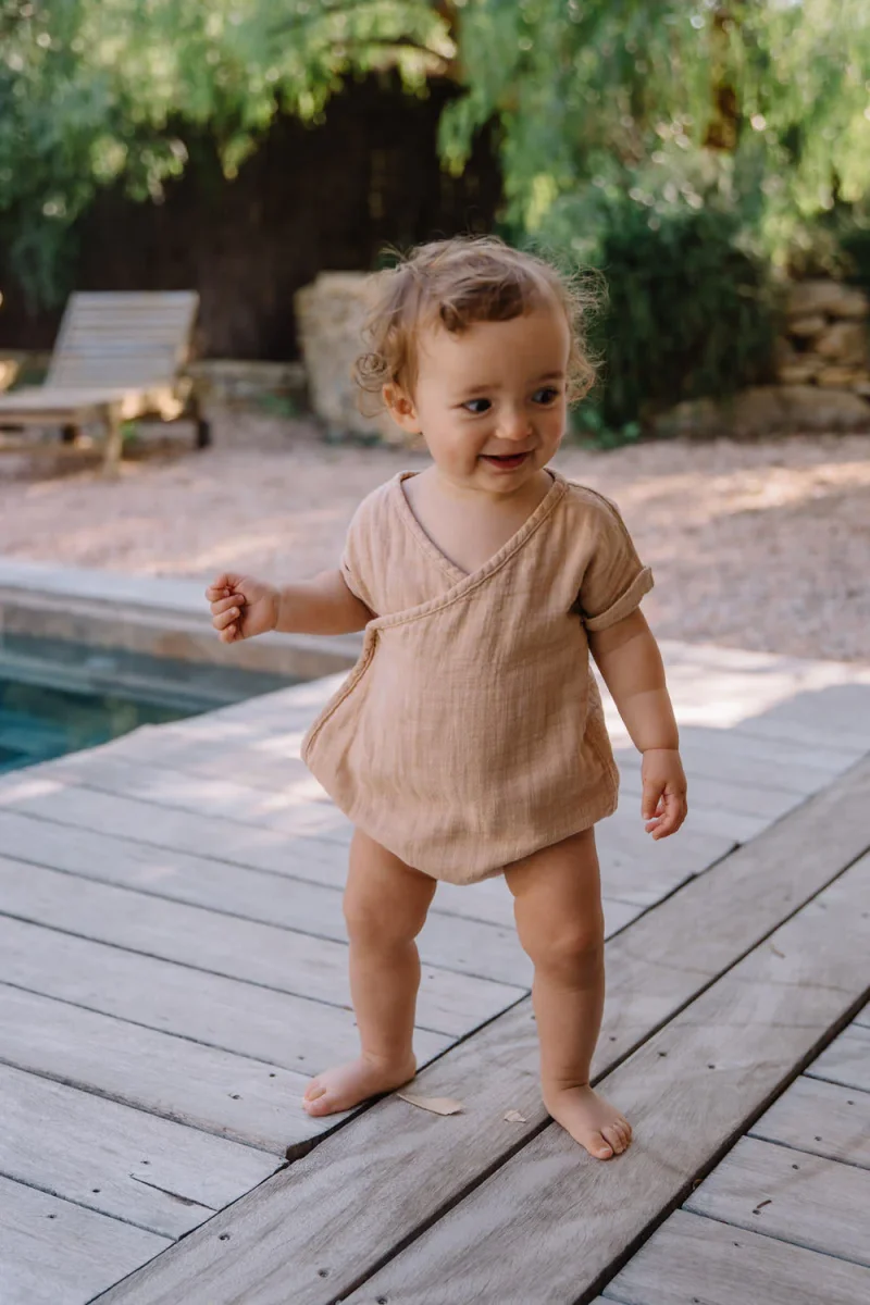 Barboteuse mixte forme Kimono en gaze de coton flammé biologique.