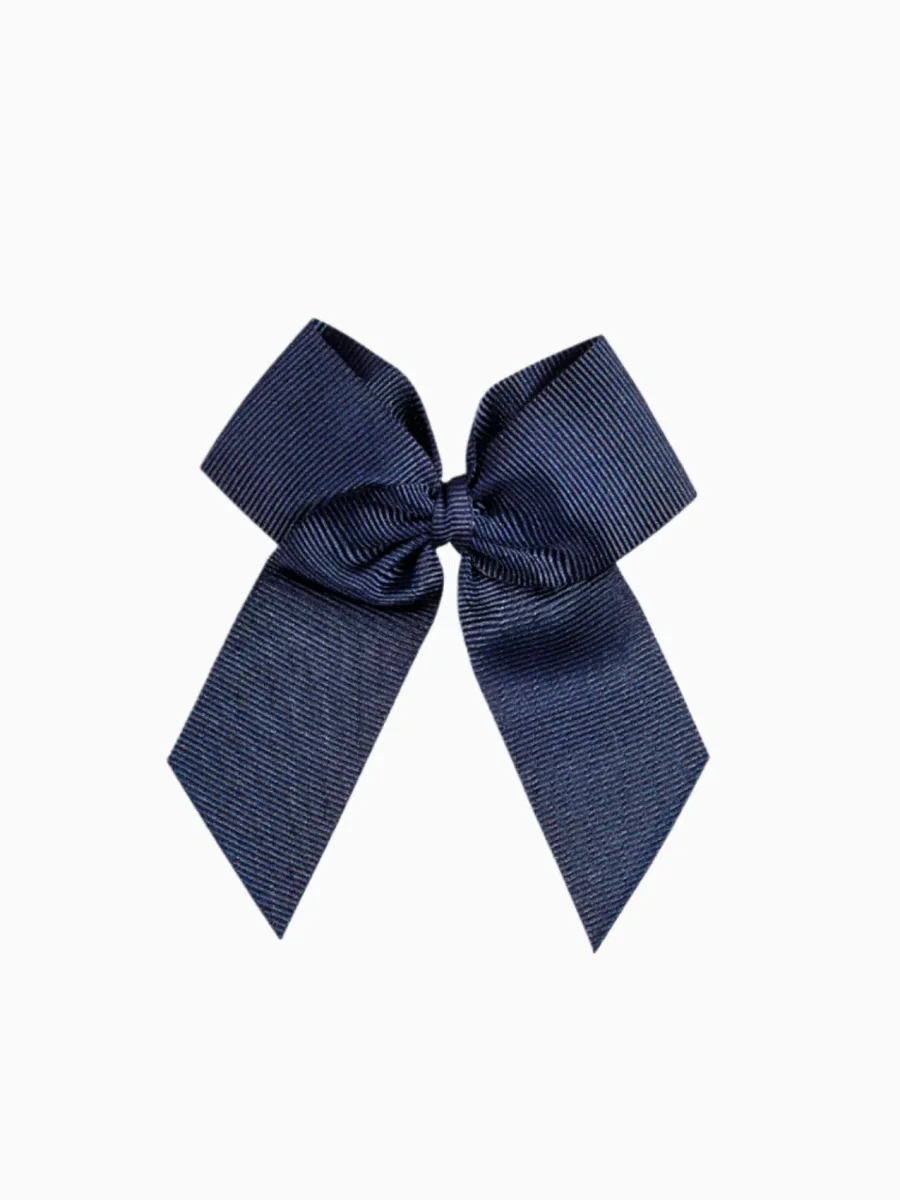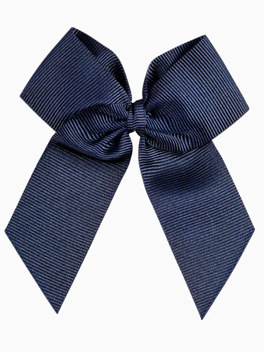 Le nœud en gros grain bleu marine, soigneusement confectionné, offre une texture élégante qui rehausse chaque coiffure avec subtilité. La barrette est fixée sur un clip robuste et facile à utiliser, garantissant un maintien parfait tout en respectant la fragilité des cheveux.