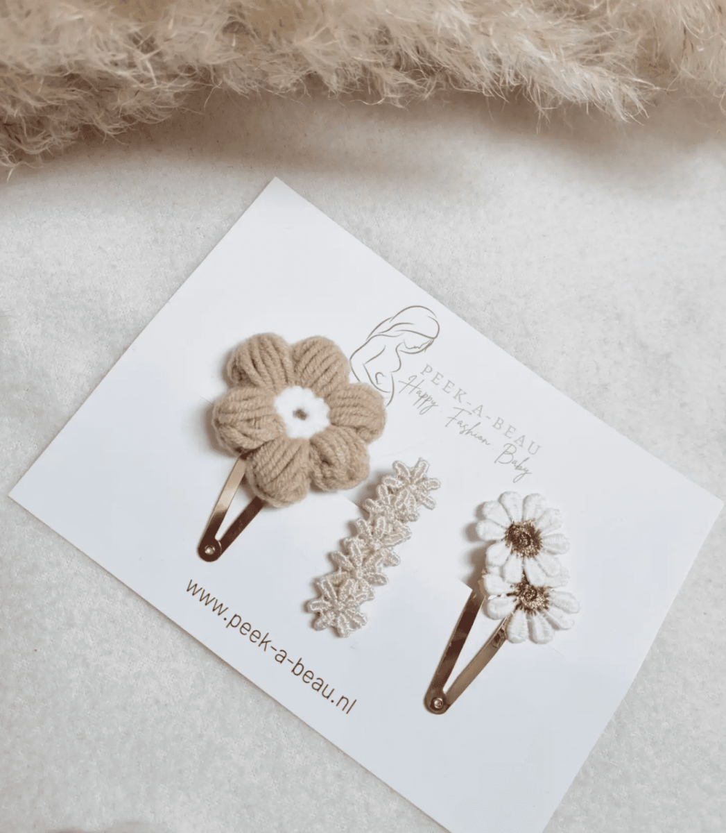 Ces barrettes à fleurs filles beige, sont les best-sellers de la marque Peek a beau ! Entièrement fabriquées à la main, elles mettront une touche de fantaisie printanières aux tenues de votre petite fille ! Ces barrettes conviennent aux petites filles dès l’âge d’un an et demi environ.