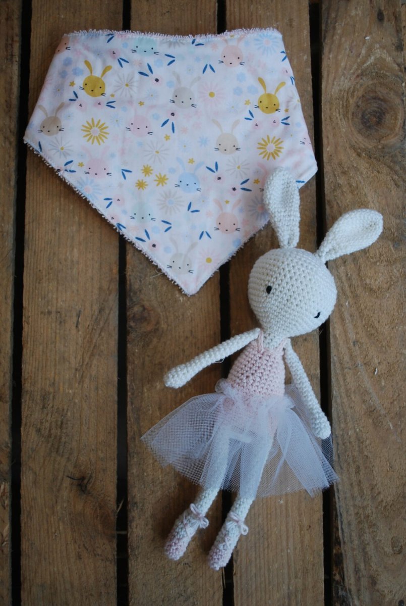 Ce bavoir foulard en coton et éponge, facile à fermer grâce à son scratch et le doudou danseuse au crochet pour amuser bébé et en faire son petit doudou.