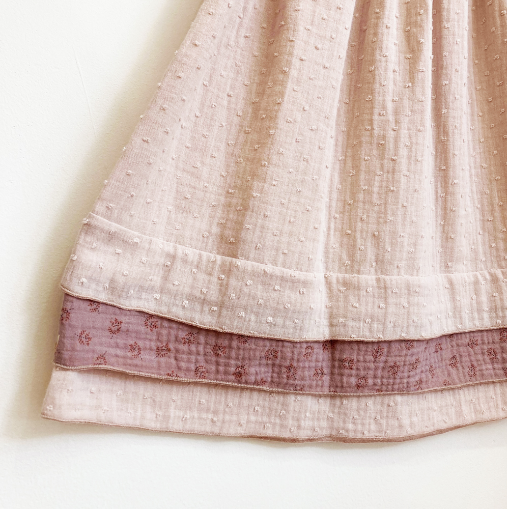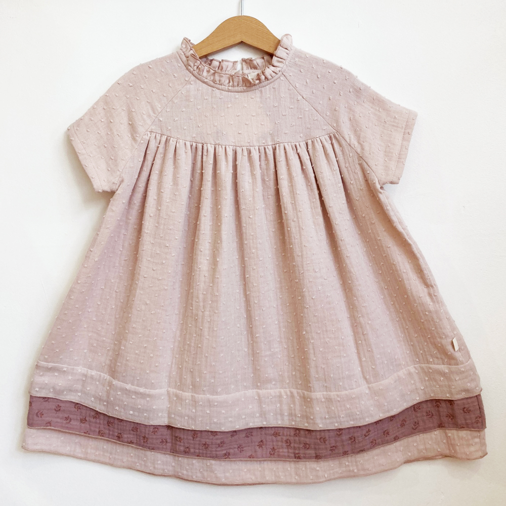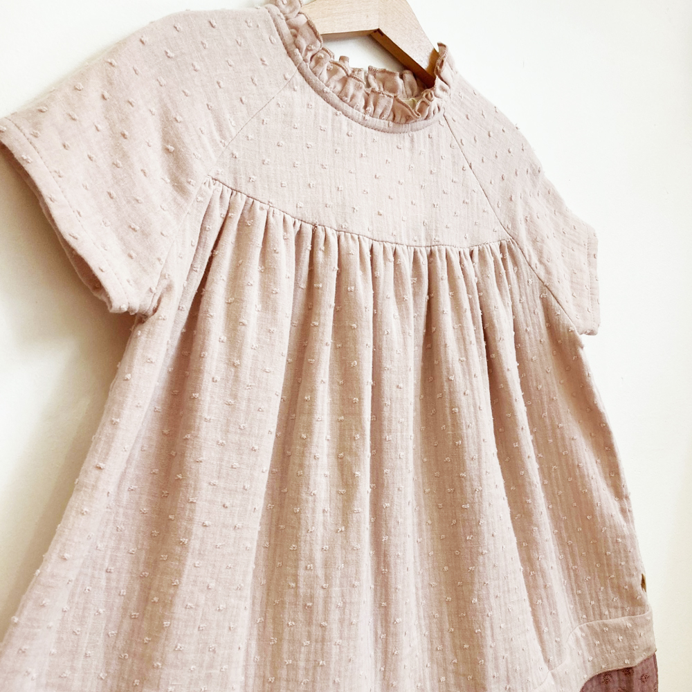 Robe 100% gaze de coton bio, boutonnée en haut du dos, volant petites fleurs sur le bas de la robe