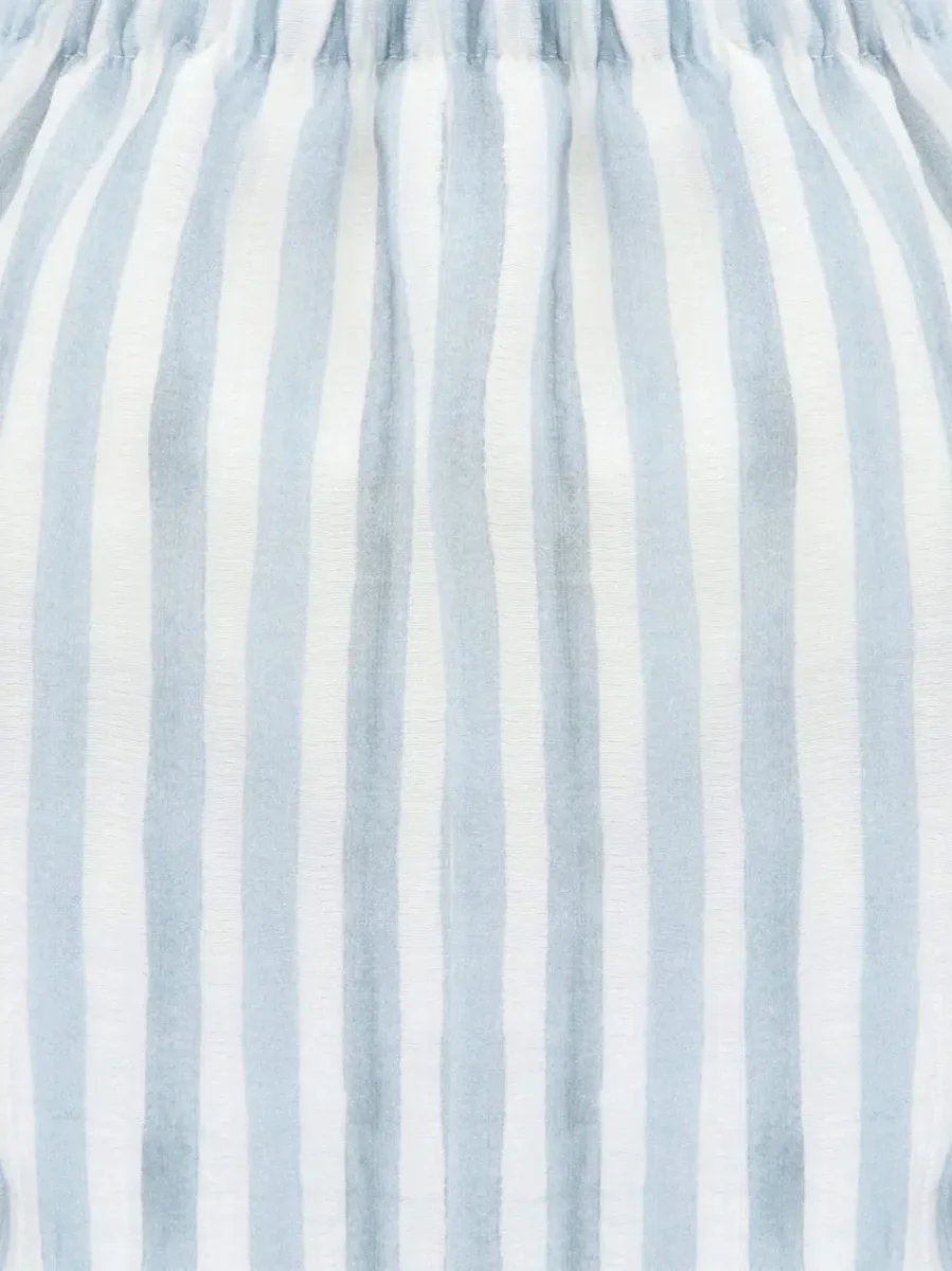 Notre bloomer bébé fille rayures poésie – Bleu/blanc apporte une touche originale et raffinée au vestiaire des tout-petits. Ses rayures bleu ciel et blanc, légèrement irrégulières, donnent l’impression d’avoir été peintes à l’aquarelle, créant un effet doux et poétique. Cette finition unique rend chaque bloomer distinct, avec un style subtilement artisanal et élégant.