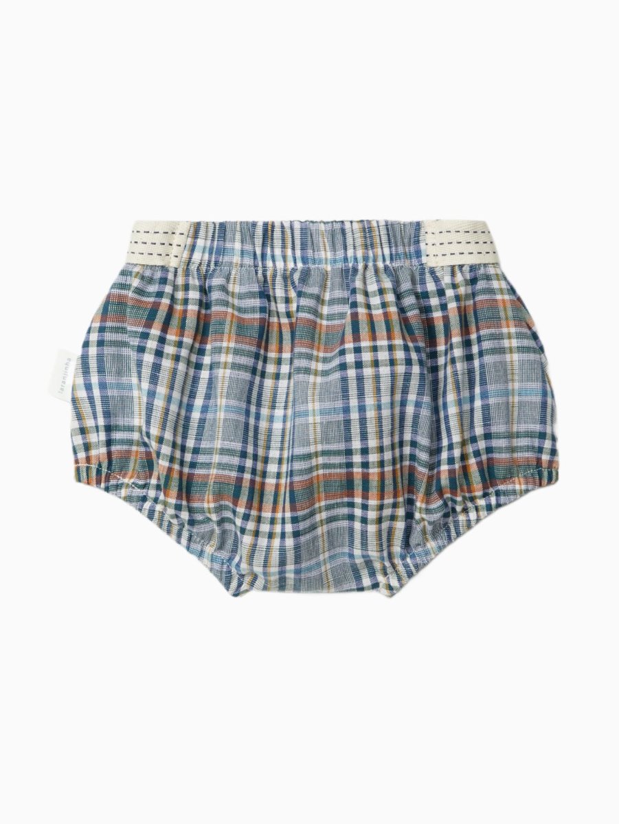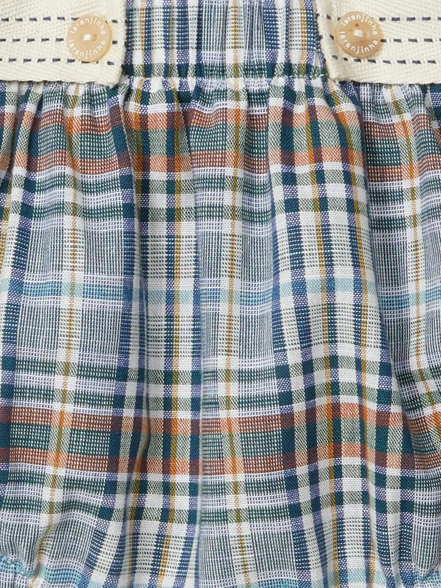 Notre bloomer bébé garçon à carreaux bleu se distingue par un motif travaillé et une palette de couleurs subtilement contrastée. Les carreaux mêlent des tons de bleu, vert, rouille et moutarde, créant un ensemble équilibré et chaleureux, pensé pour les tout-petits. Ce jeu de couleurs apporte du relief tout en restant facile à associer avec une blouse ou un body uni.