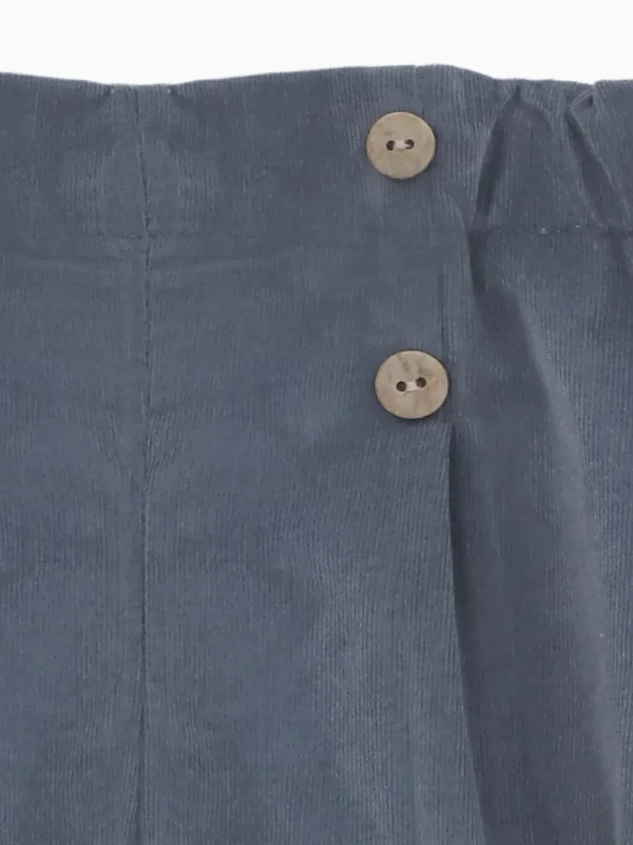 Ce bloomer en velours côtelé bleu se marie facilement avec une blouse à col ou un cardigan en laine pour composer des tenues simples et élégantes. En hiver, il se porte avec des collants ou des chaussettes hautes, tandis qu’au printemps, il accompagne bodies et chemises légères pour un look à la fois raffiné et pratique, prêt à suivre toutes vos balades en famille.