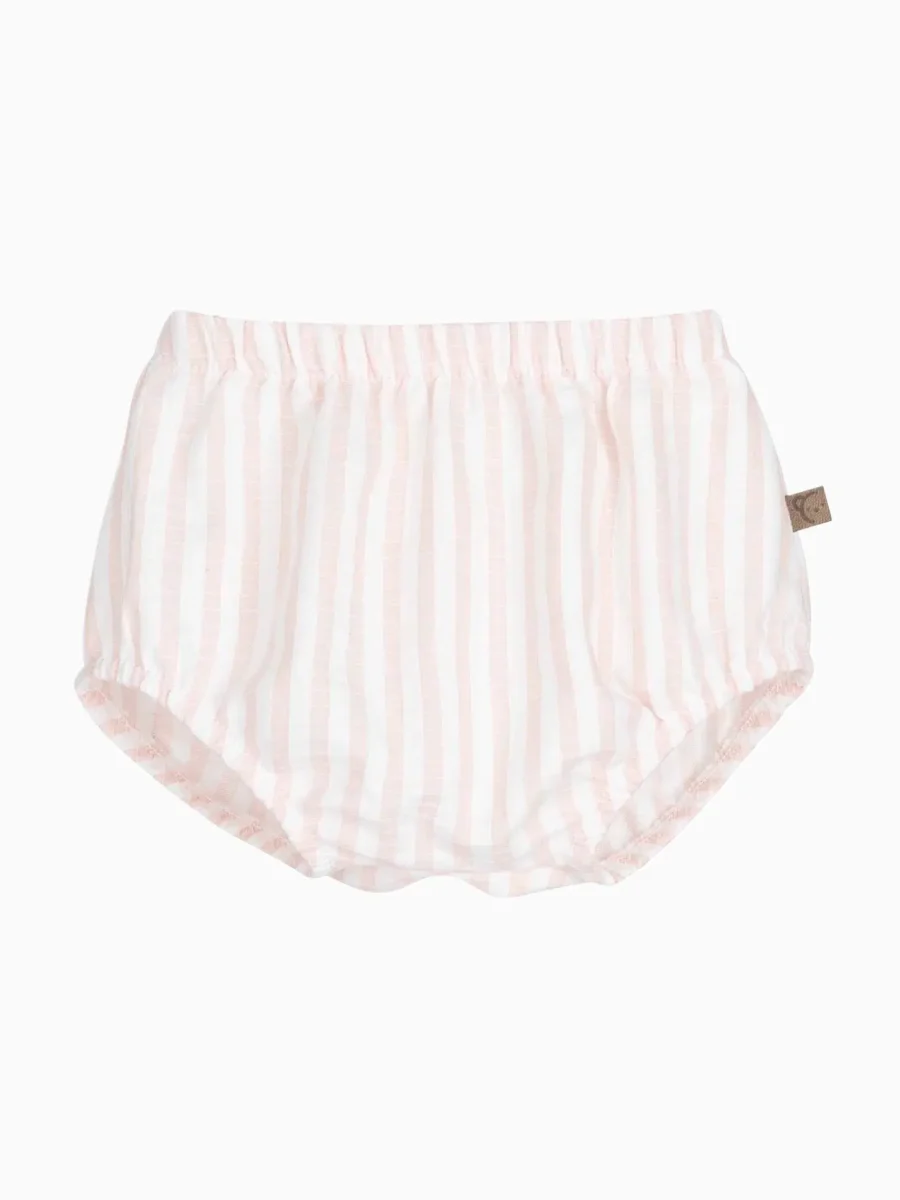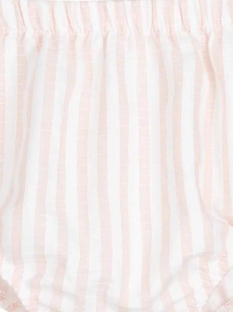 Ce bloomer rayé rose et blanc se combine aisément avec un body blanc, une petite blouse ou un top uni pour créer des tenues assorties et harmonieuses. Sa couleur lumineuse et son aspect texturé apportent du caractère aux ensembles, tout en restant délicats et élégants.