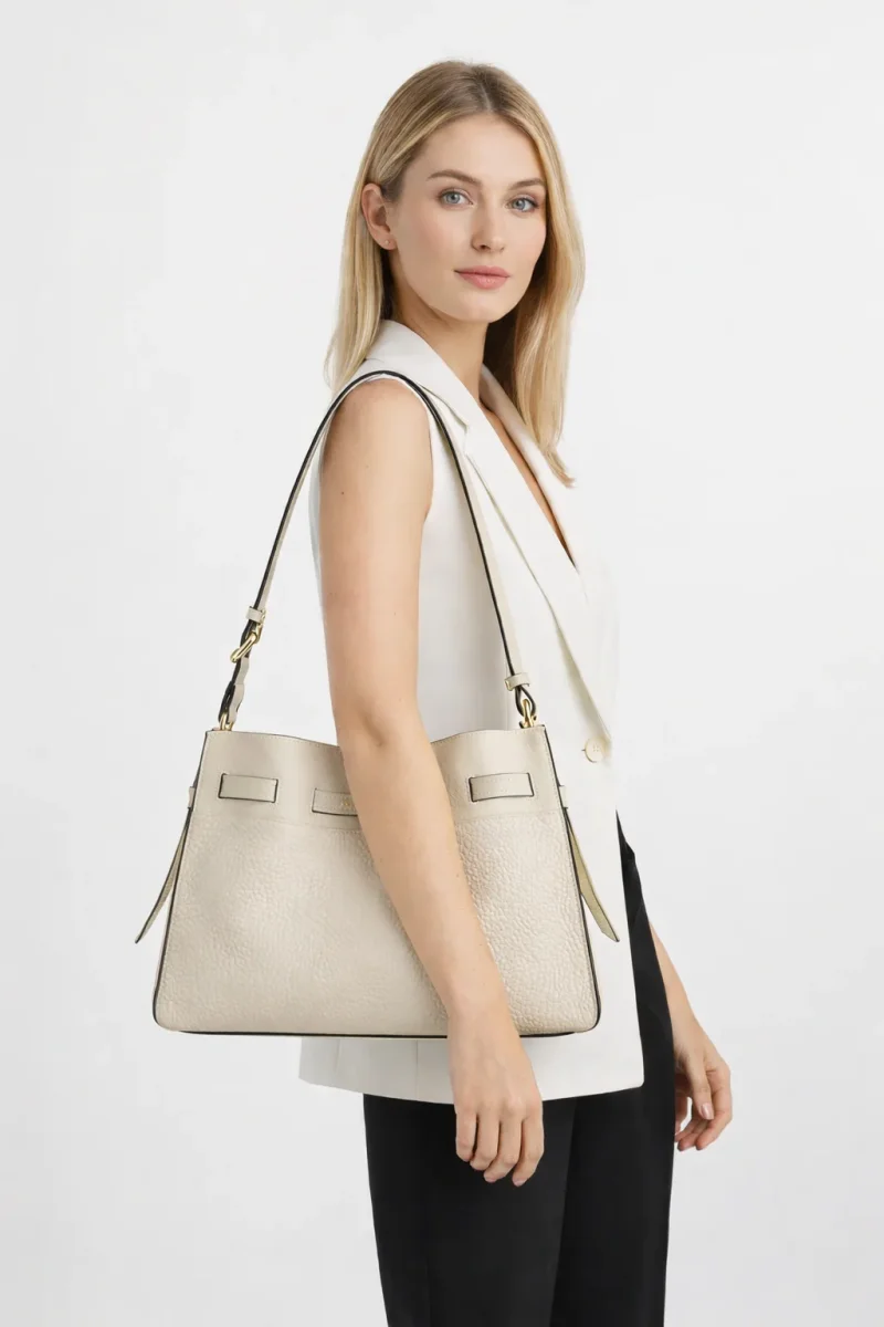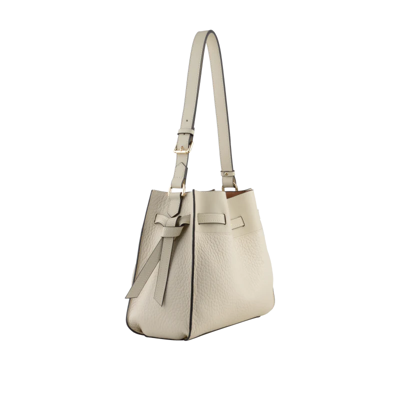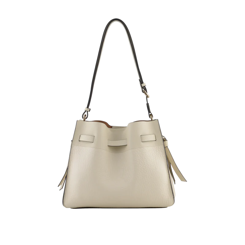La besace est dotée d’une anse en cuir ajustable, permettant un port à l’épaule ou en travers du corps pour un maximum de confort. Les finitions en métal doré ajoutent une touche de sophistication, tandis que les lanières décoratives sur les côtés rehaussent son esthétique générale.