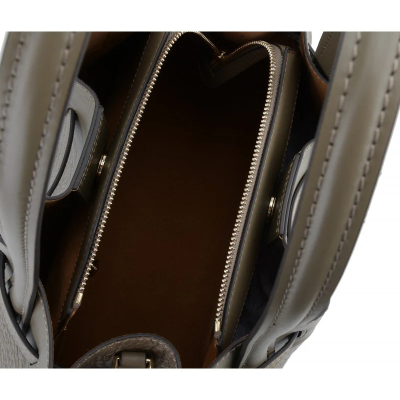 Les dimensions du sac, mesurant 36 x 23 x 16 cm, en font un modèle de taille moyenne, parfait pour un usage quotidien. L’intérieur est doublé d’un tissu doux dans une teinte marron, et il comprend un espace central sécurisé par une fermeture éclair, ainsi que deux compartiments supplémentaires à l’avant et à l’arrière, refermables par aimant, pour un rangement optimal.