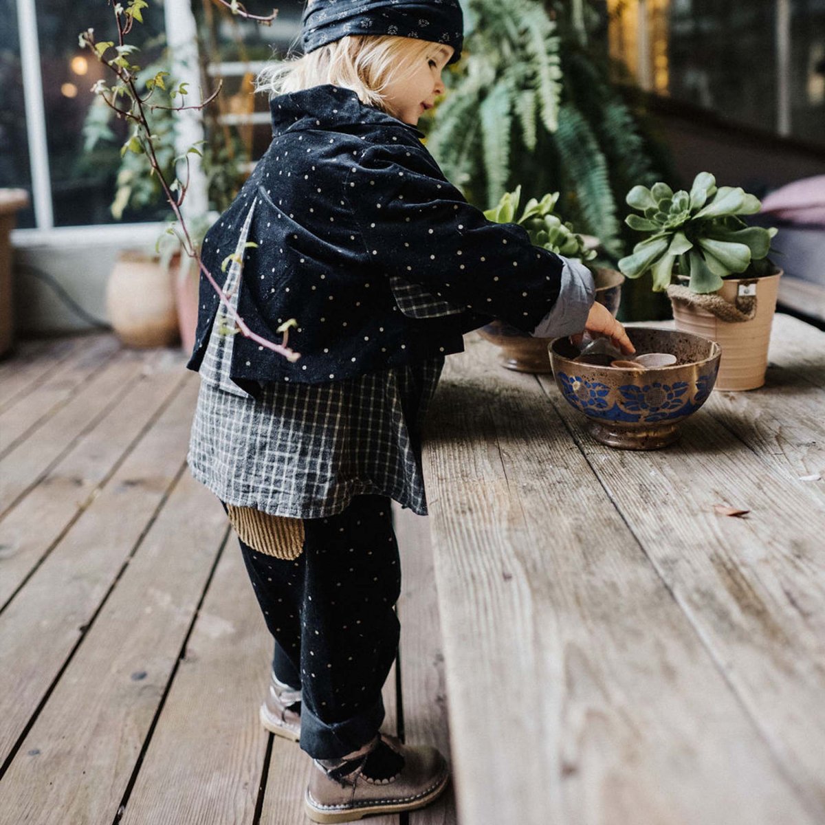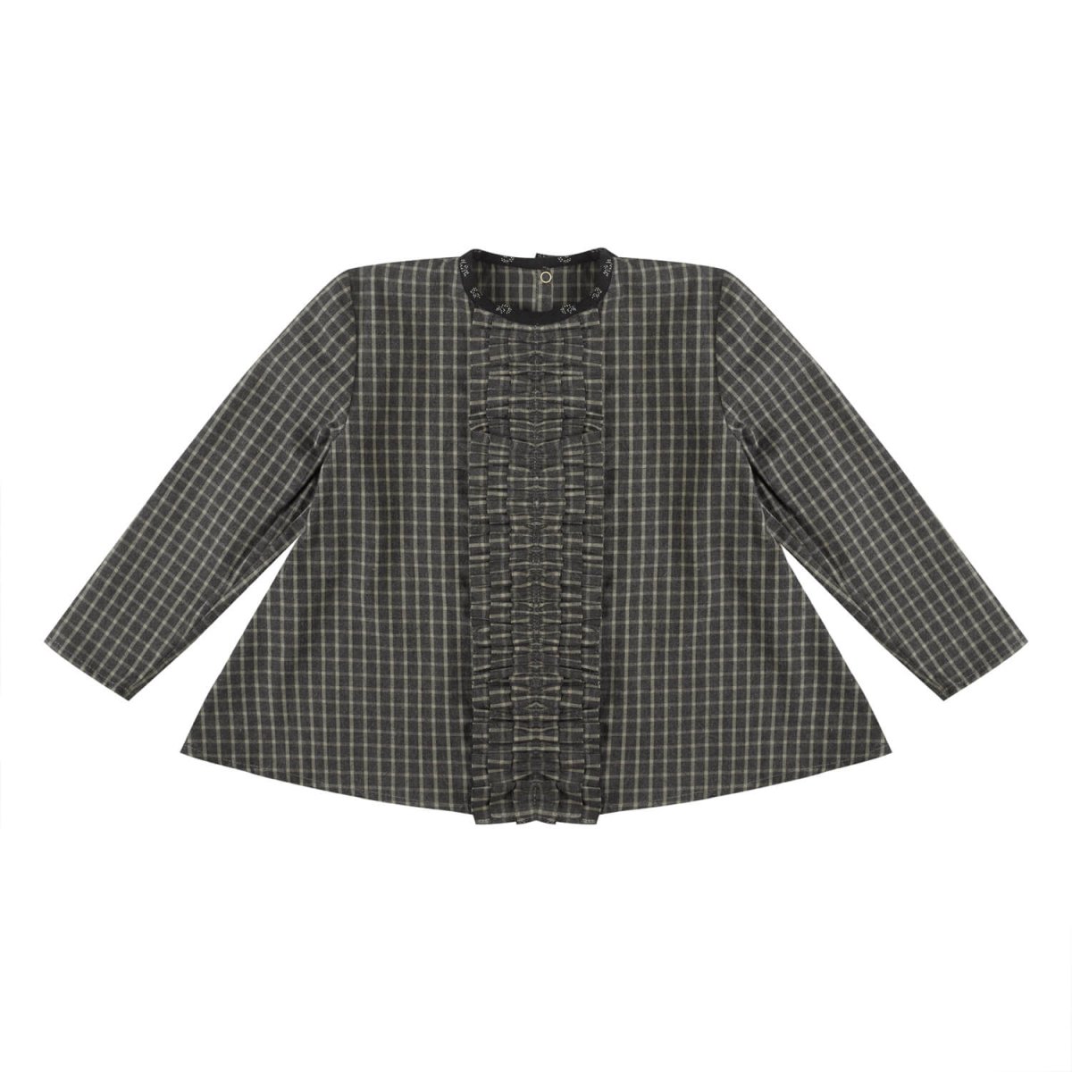 Blouse 100% coton organique, boutonnée en haut du dos, petit jabot sur le devant