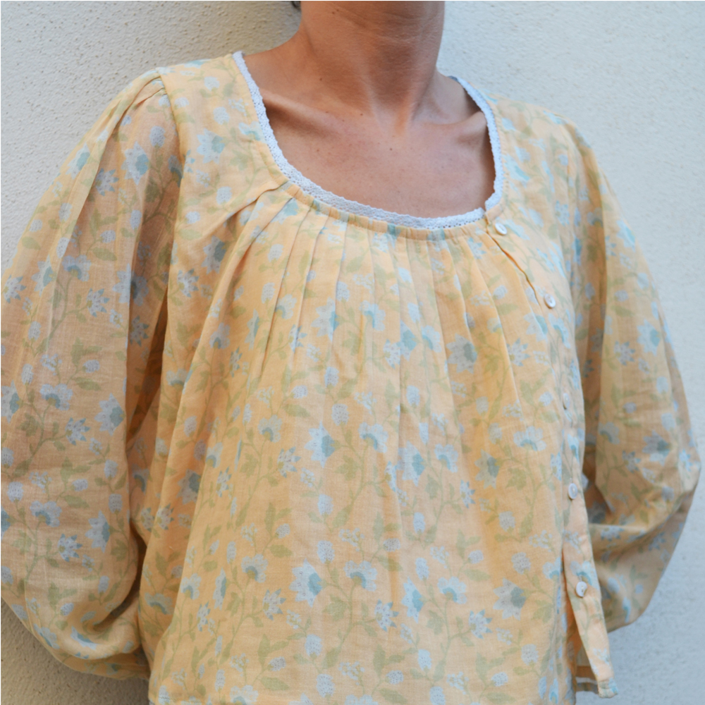 doublée voile de coton, manches smockées, boutonnée sur le côté, jolie dentelle au niveau du col