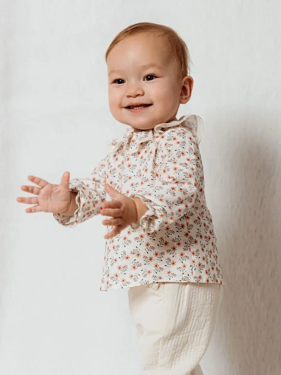Notre blouse fille à col dentelle et imprimé fleuri crème se marie parfaitement avec un bloomer, une jupe, un pantalon en velours côtelé ou une salopette, selon la saison. Elle permet de créer des tenues élégantes et cohérentes, fidèles à un vestiaire enfantin intemporel.