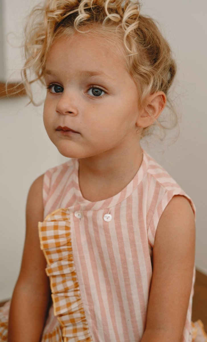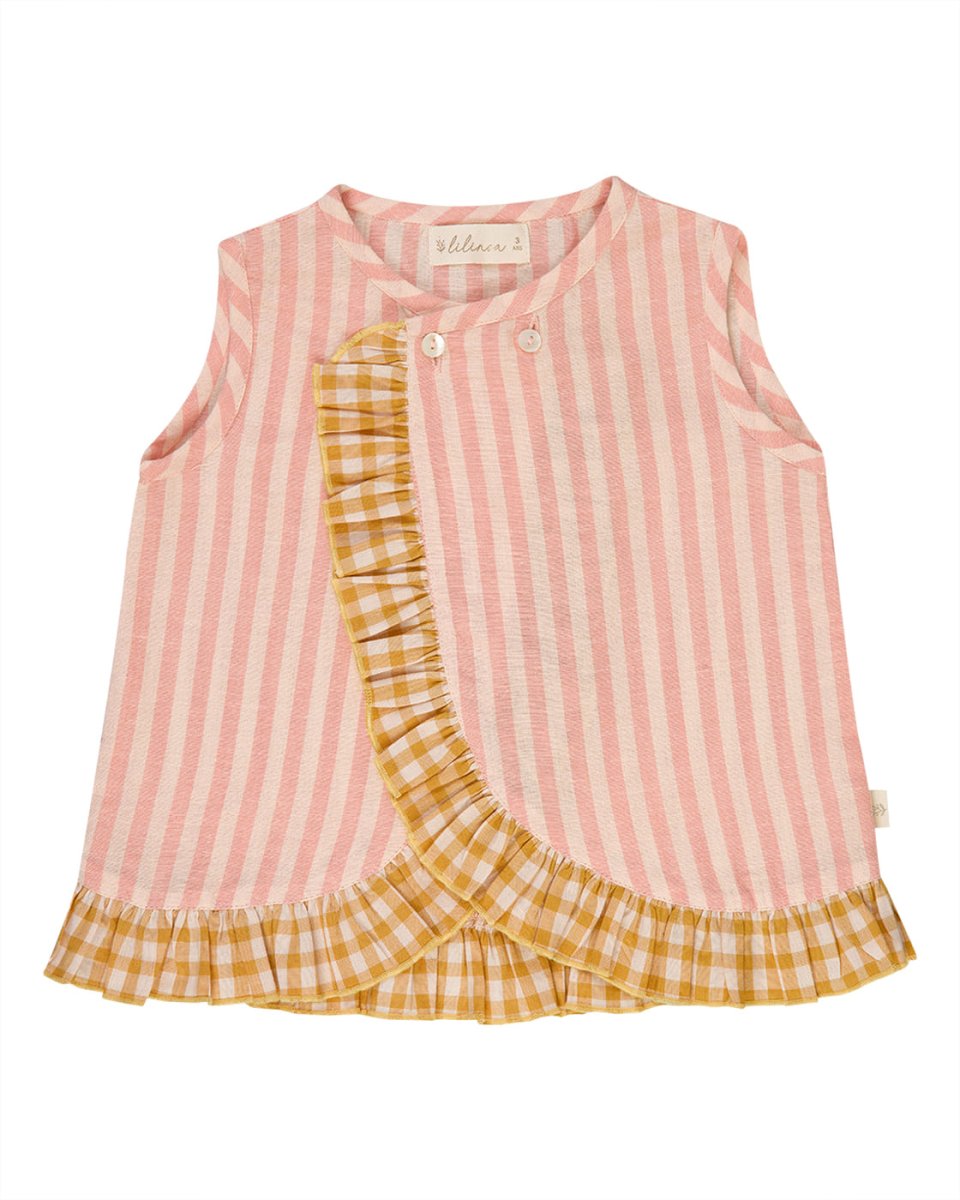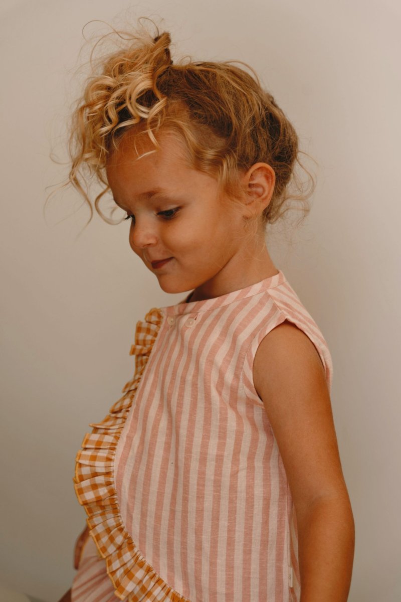 Blouse Iris rayée rose Blouse en coton léger avec imprimé rayée. Boutonnée sur le devant, son volant du col au bas apporte élégance et légèreté. Confortable, douce et raffinée, idéale pour un look chic au quotidien.