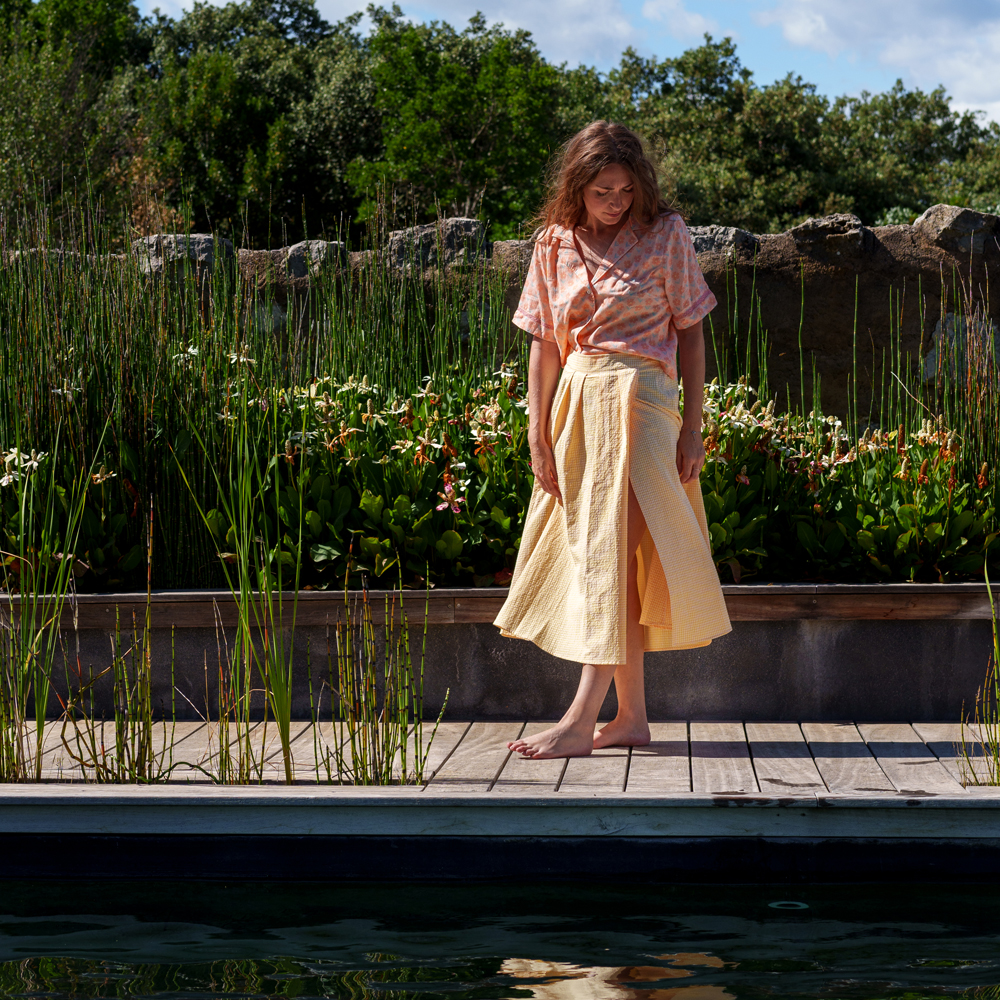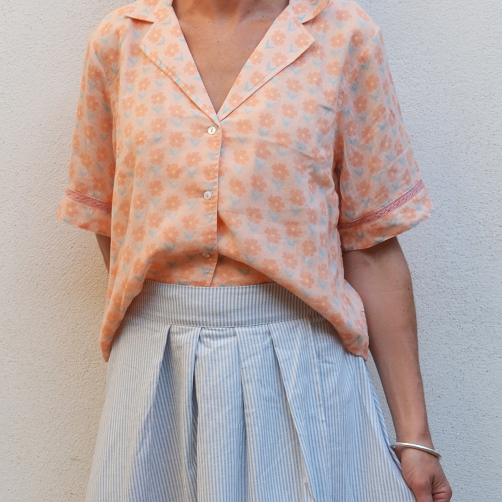 doublée voile de coton, manches courtes, boutonnée sur le devant