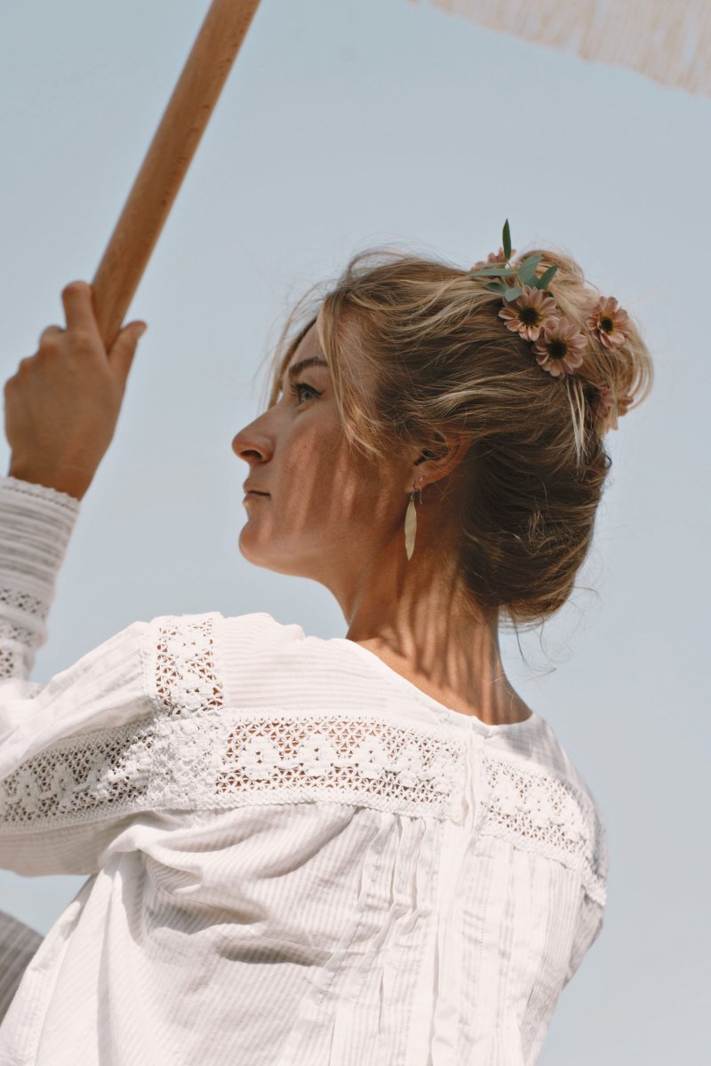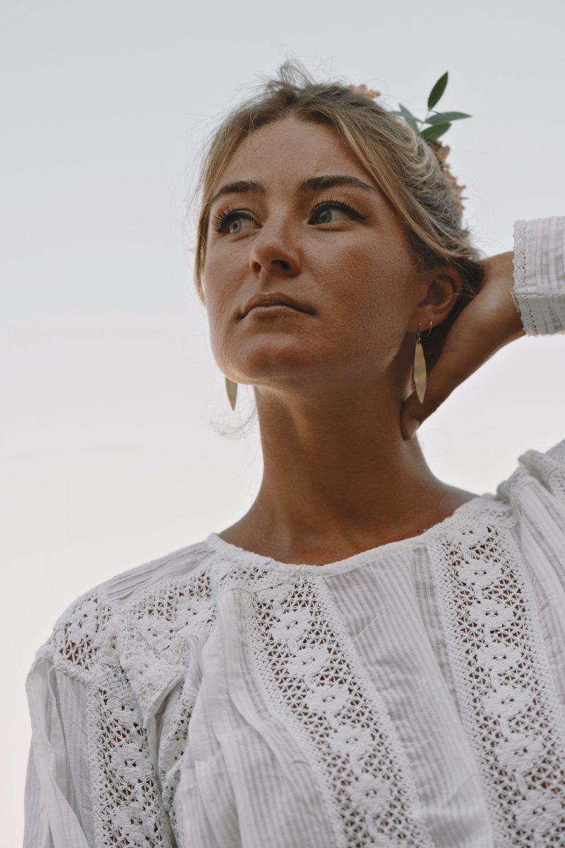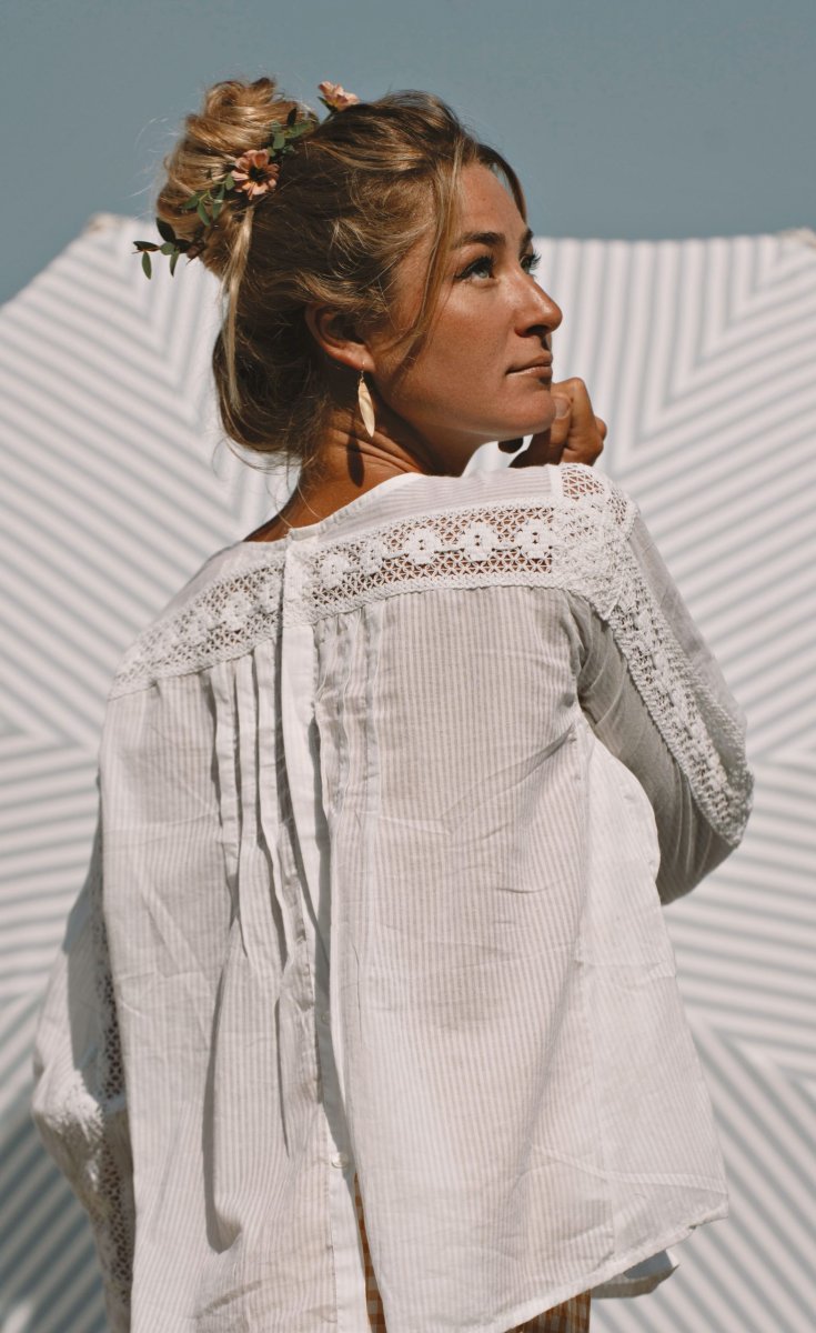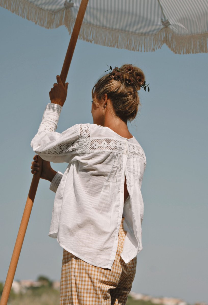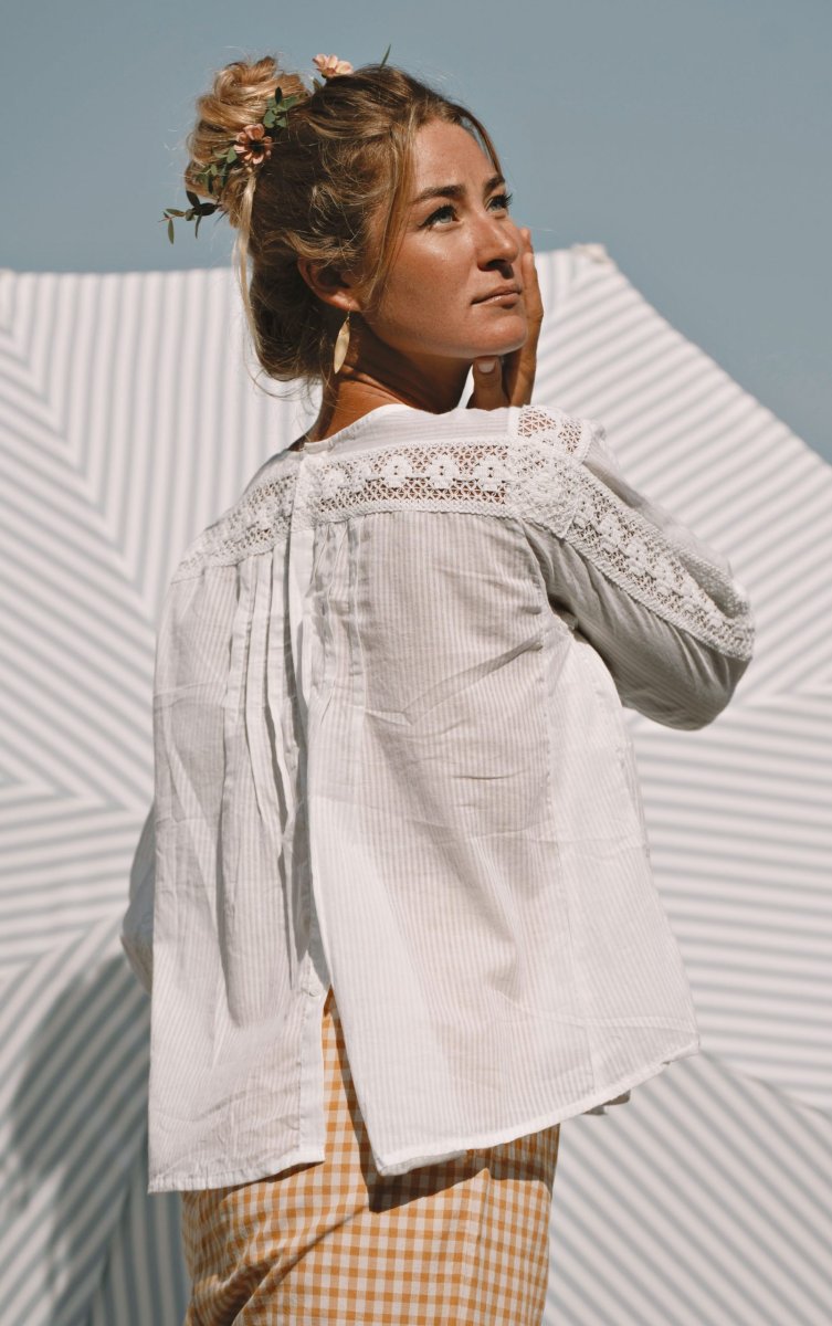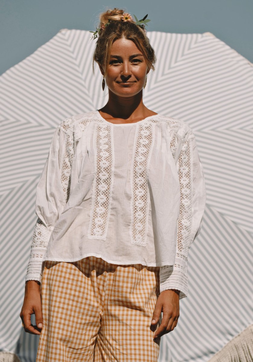La blouse Louison est sans doute la pièce la plus travaillée de la collection. Confectionnée en 100% coton, elle séduit par la richesse de ses détails et son allure délicatement vintage.