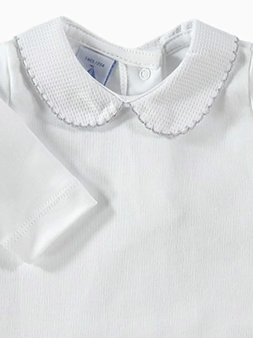 Confectionné avec soin en Espagne, ce body témoigne du savoir-faire et de la qualité exceptionnels des fabricants européens. La texture raffinée du col rond ajoute une dimension unique à ce vêtement, lui conférant une allure distinguée. Les manches longues sont idéales pour les journées fraîches, offrant à votre bébé chaleur et confort tout en restant stylé.