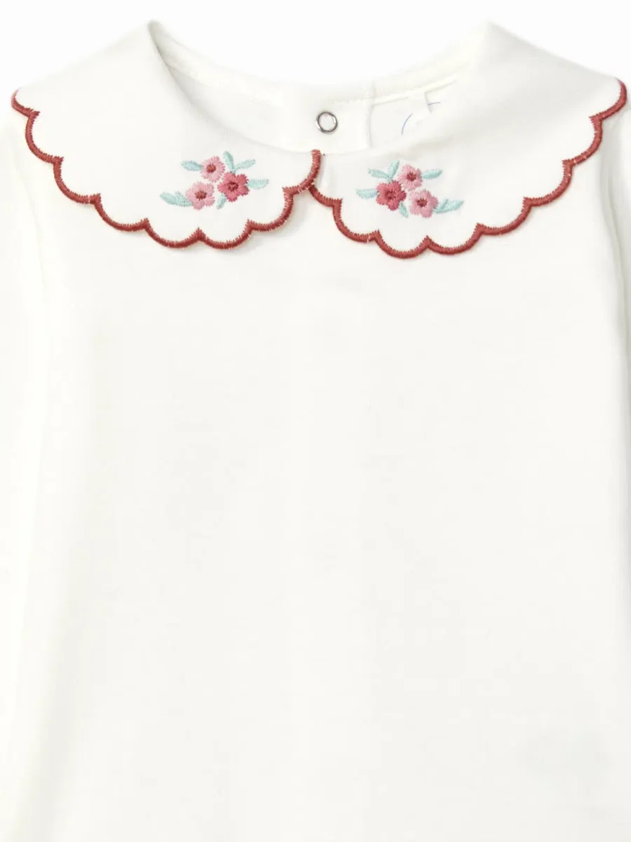 Le col brodé de petites fleurs aux tons roses, souligné d’un fin liseré rose, apporte une note poétique et discrète qui fait toute la différence. Ce détail délicat sublime la tenue de votre bébé même sous un pull ou un cardigan, laissant apparaître un joli col qui rehausse l’ensemble sans effort.