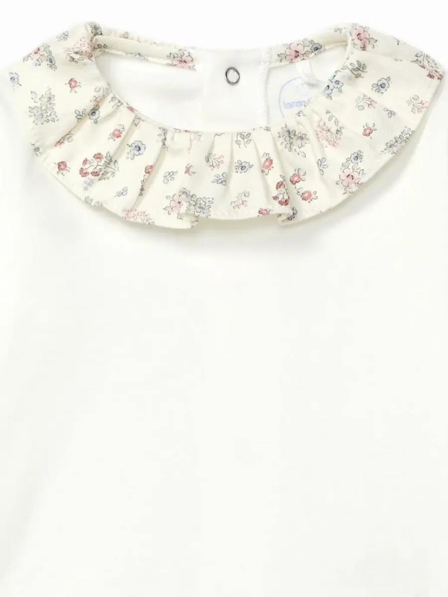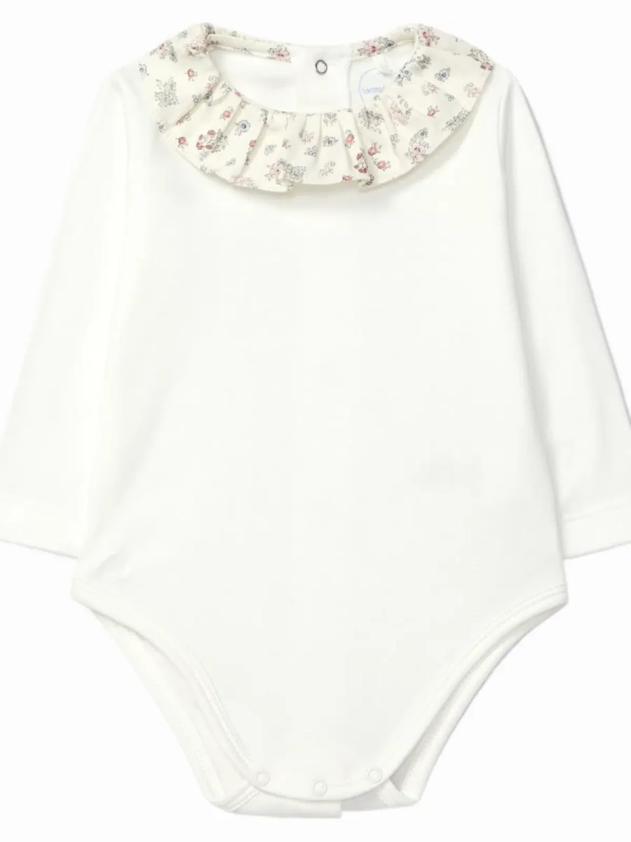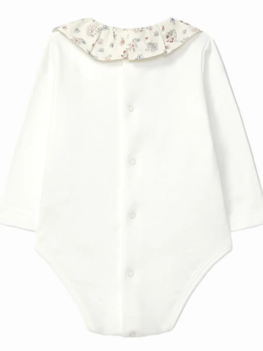 Manches longues Col volanté à motifs floraux Fermé par une patte de boutons-pression au dos Boutons-pression à l’entrejambe 100% coton Fabriqué au Portugal Ce body taille normalement. Choisissez la taille habituelle.