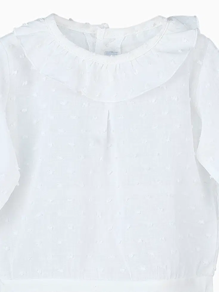 Le design ingénieux de ce body en coton texturé Plumetis donne l’illusion d’une blouse sophistiquée grâce à sa collerette délicate, qui apporte une note de raffinement intemporel à la tenue de votre petite princesse. Confectionné dans un coton fin et léger, ce body assure un confort optimal tout au long de la journée, même pour les peaux les plus sensibles.