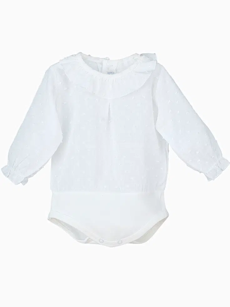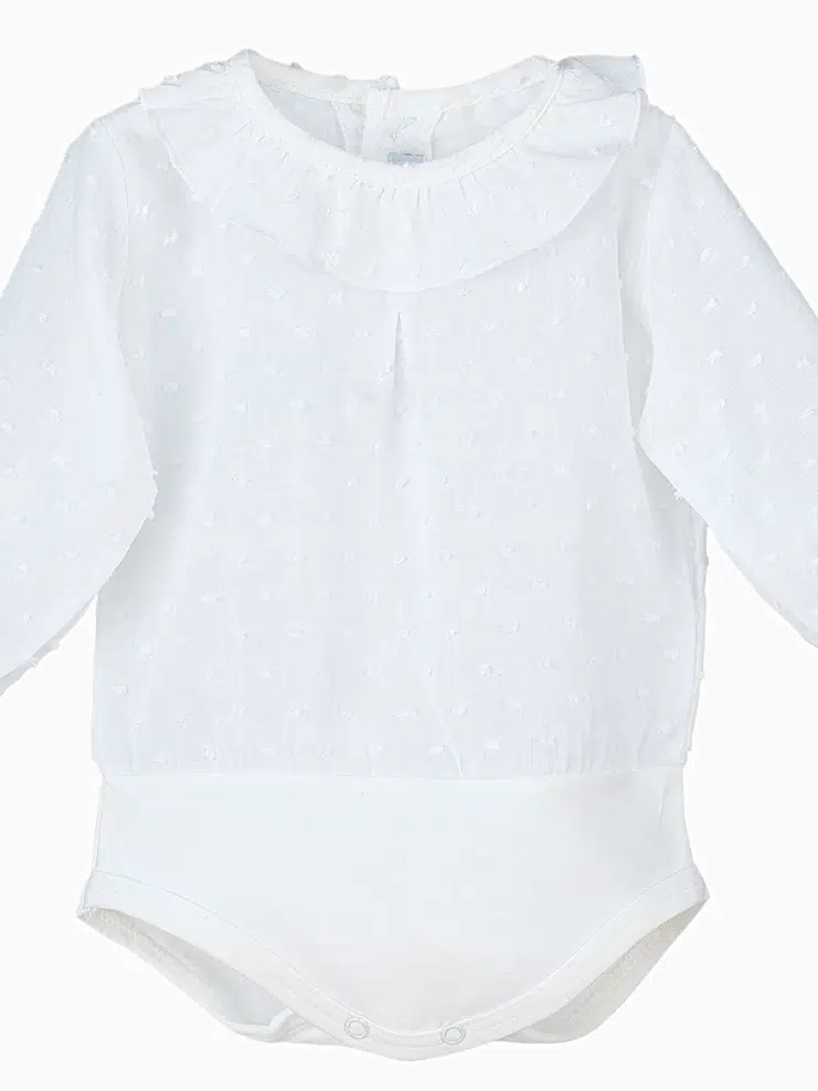 Optez pour ce body bébé collerette en plumetis écru, un incontournable de la garde-robe de votre enfant, qui allie style intemporel, confort et qualité espagnole.
