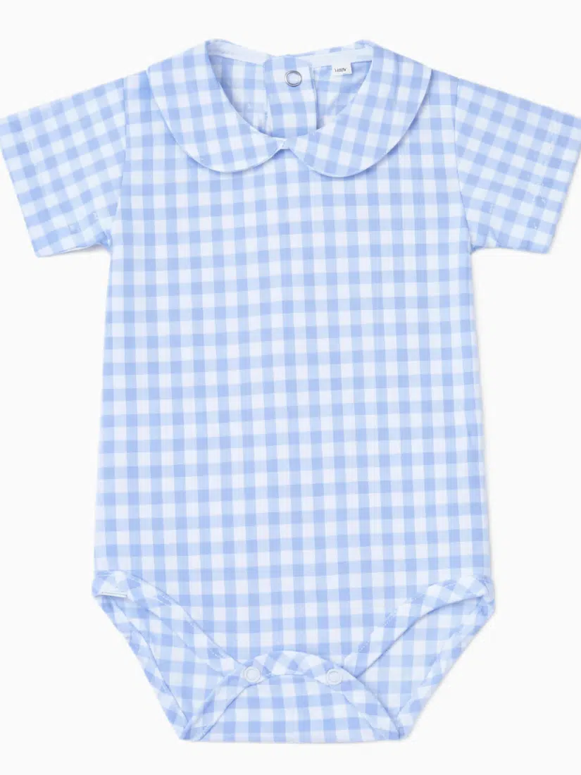 Choisissez notre body vichy bleu ciel à col rond pour envelopper votre bébé d’un charme rétro et d’un confort durable.