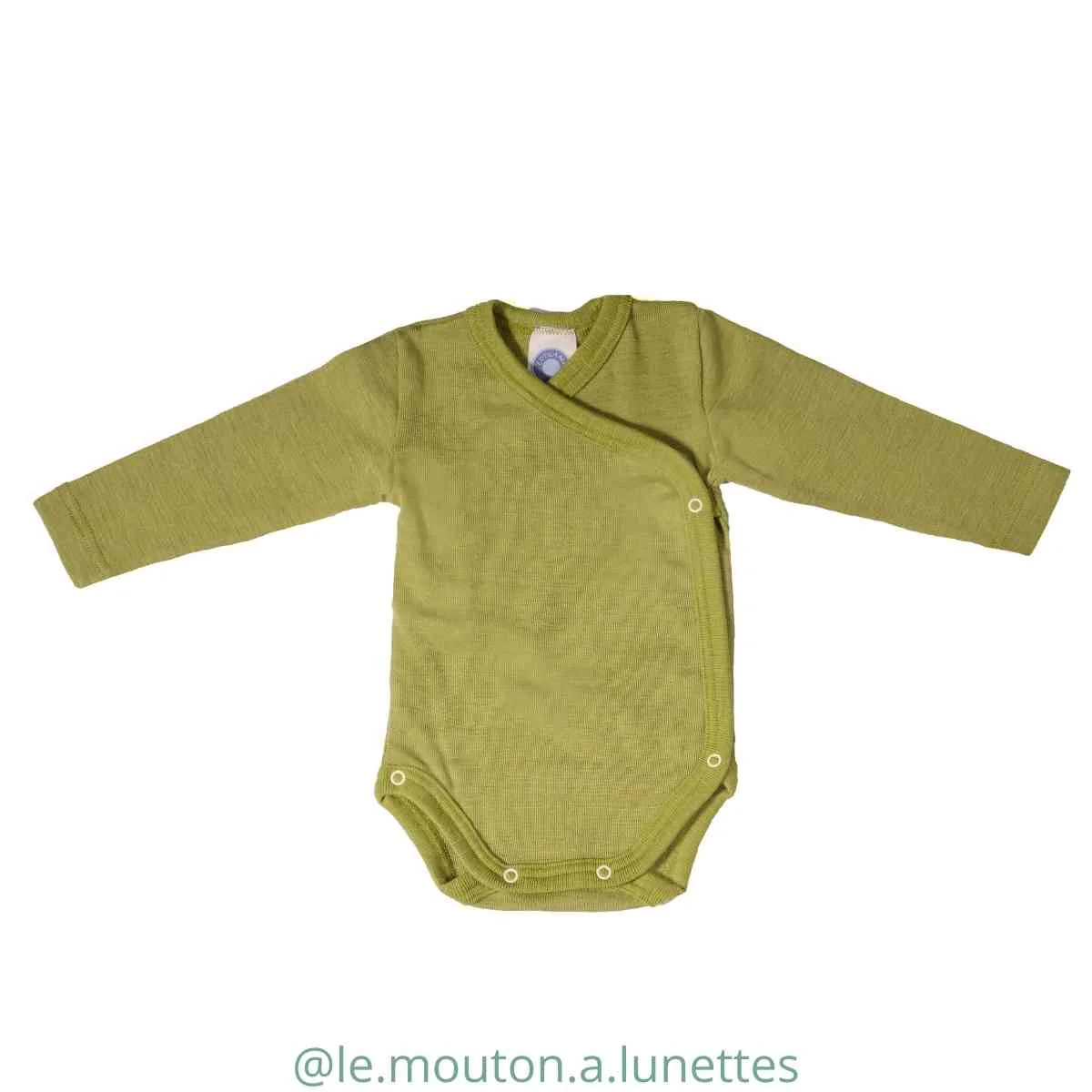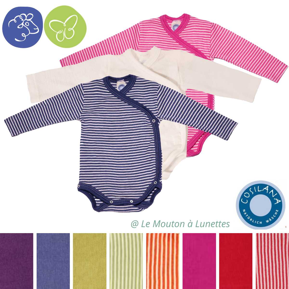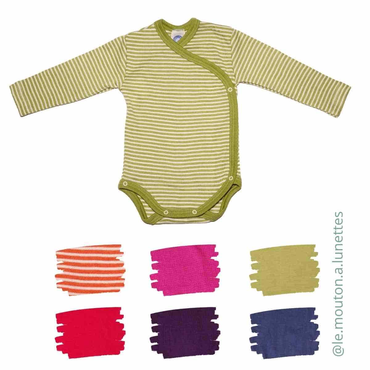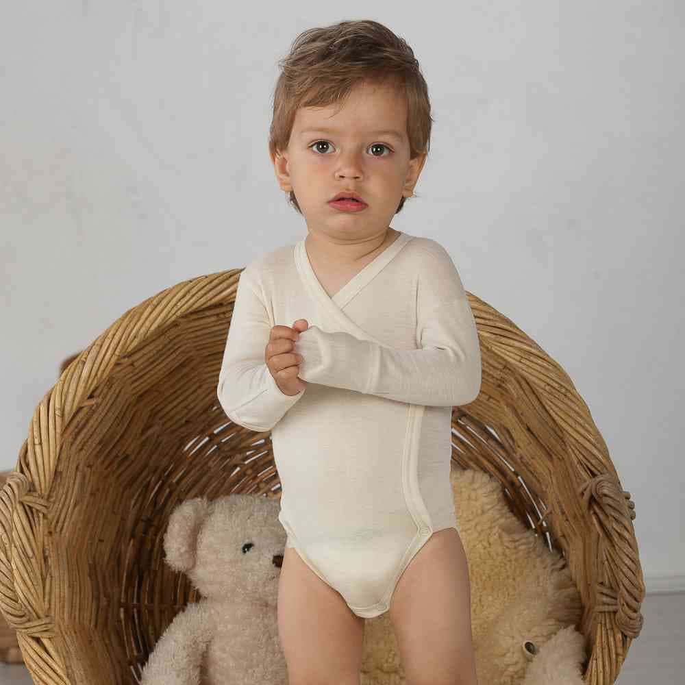 Body croisé en laine mérinos bio et soie naturelle de la marque allemande Cosilana : un essentiel pour bébé en toutes saisons, doux et thermorégulateur. Manches longues.