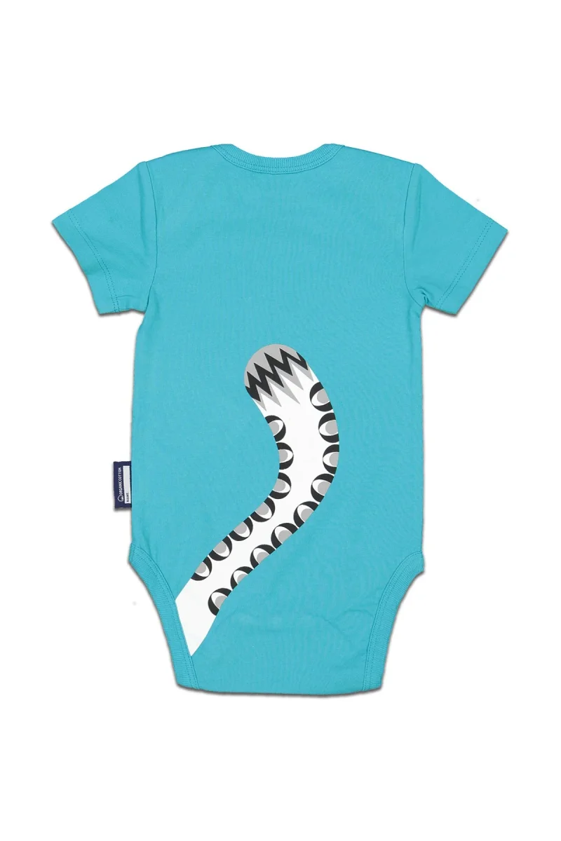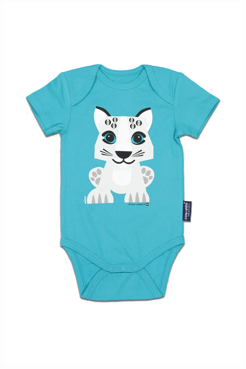 Body bébé à manches courtes avec illustration recto/verso Léopard des neiges par Mibo, composé à 100% de coton biologique.