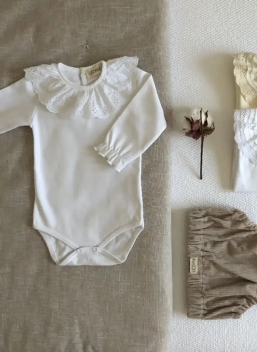 Body bébé élégant avec un col en broderie anglaise délicate. Les manches longues se terminent par un détail élastiqué pour un maintien confortable. La fermeture pratique se fait par deux boutons-pression à l’entrejambe et deux au dos, facilitant l’habillage et le change.