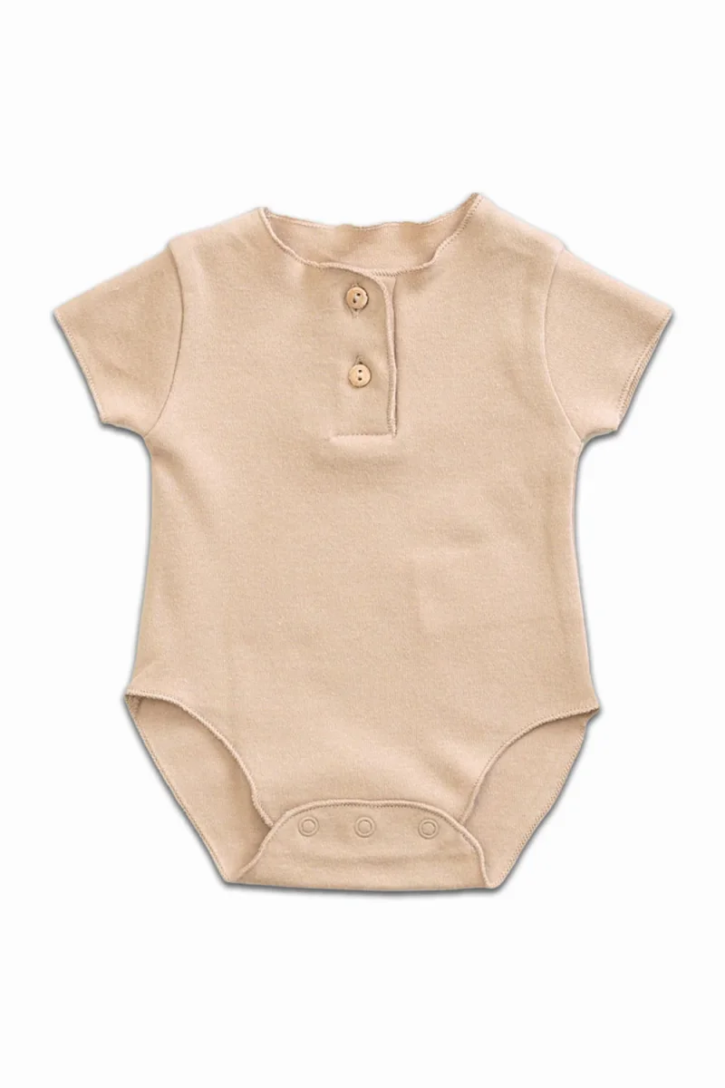Ce body fait de coton biologique est un modèle à manches courtes avec une encolure ronde, une ouverture sur le devant avec deux boutons en bois léger. Une ouverture entre les jambes avec trois boutons à clip en métal fabriqués sans nickel permet un change facile.