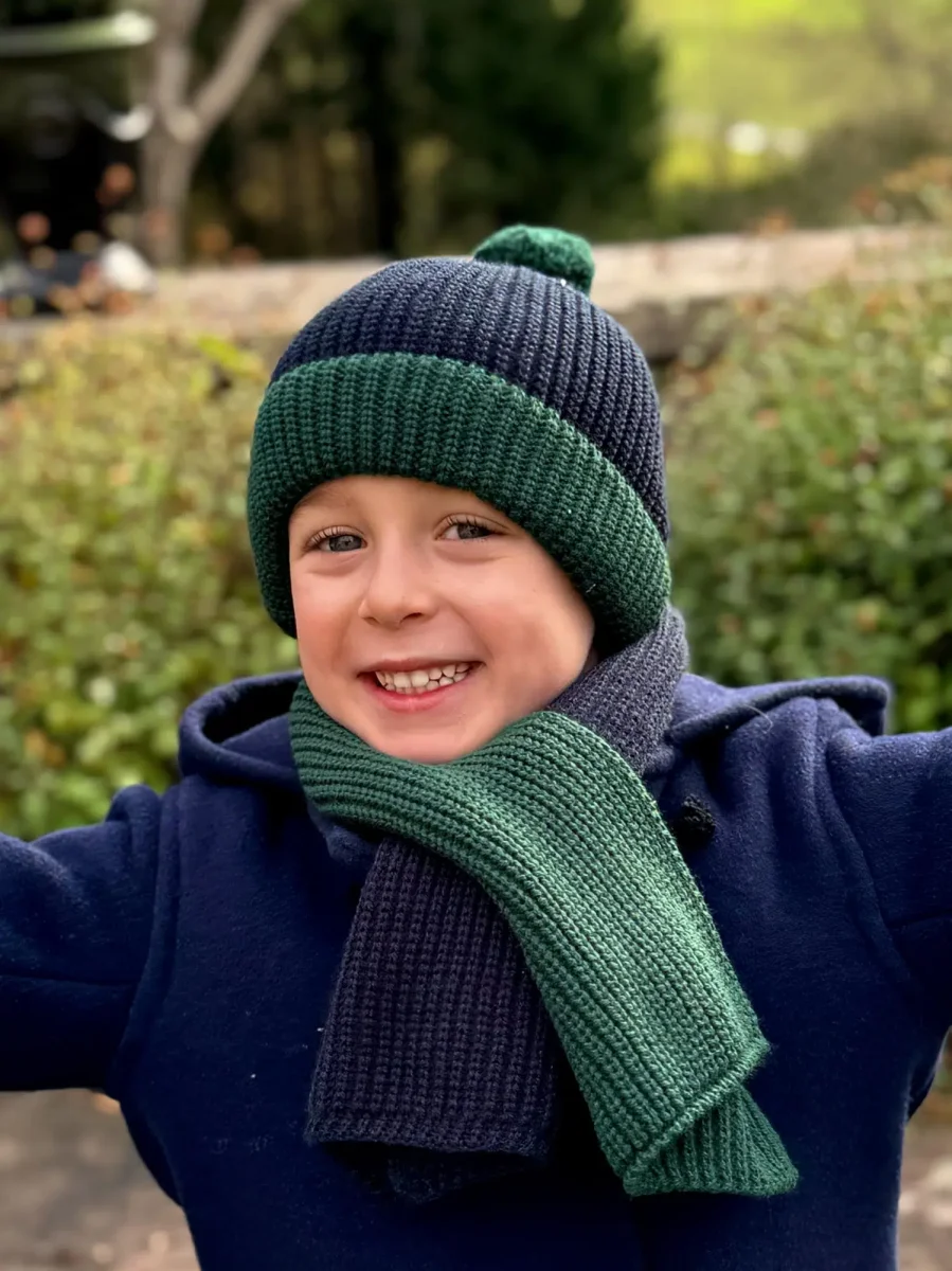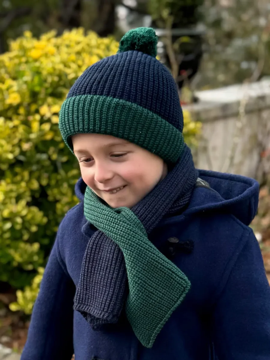 Le bonnet arbore une combinaison de couleurs bicolore bleu marine et vert, offrant un look classique et sophistiqué qui convient à toutes les occasions. Le pompon ajoute une touche ludique et élégante, rendant ce bonnet aussi amusant qu’adorable. Associé à l’écharpe assortie, il constitue un ensemble parfait pour protéger votre petit garçon du froid tout en lui donnant un style irrésistible.