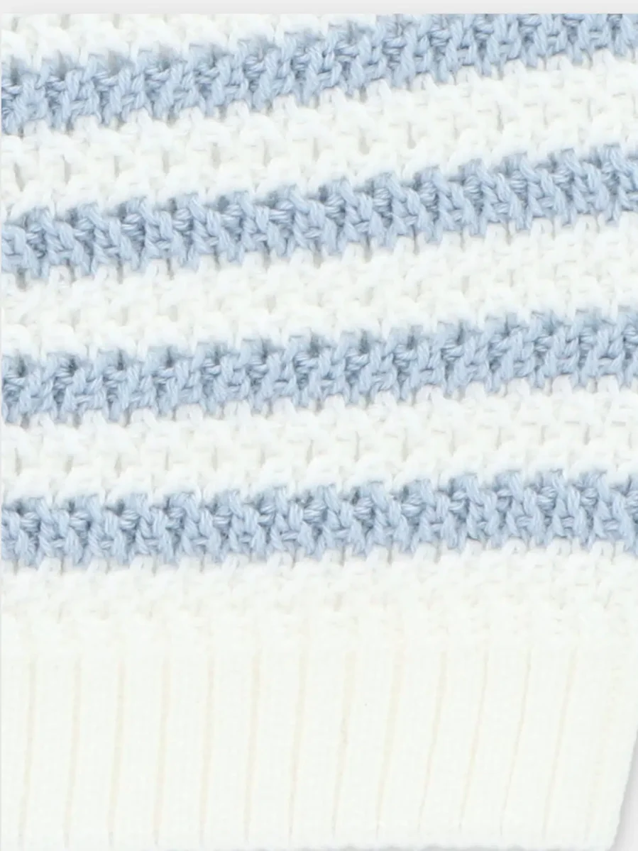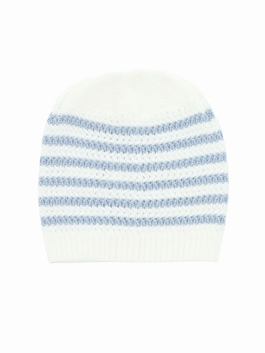 Les rayures bleu ciel sur fond blanc apportent une touche subtile et lumineuse au bonnet.