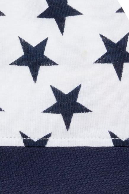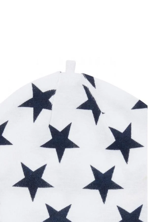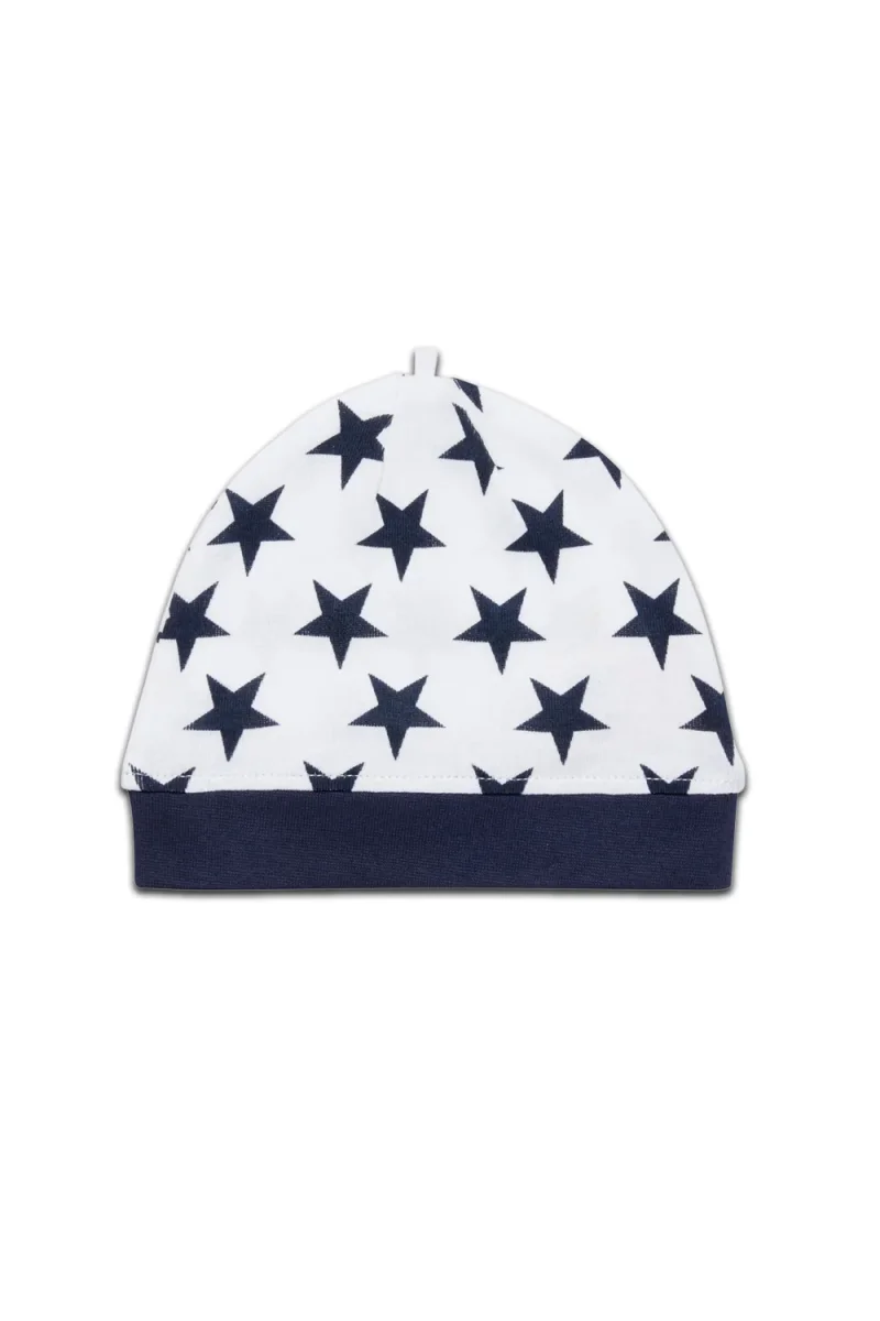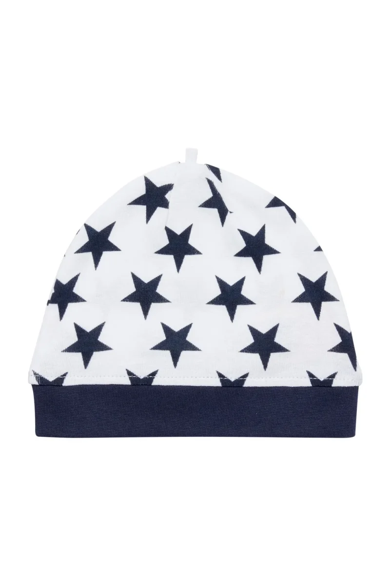 Ce bonnet pour bébé est doux et moelleux ; il est idéal pour protéger la peau sensible de bébé du soleil et des courants d’air froid. Il est confectionné en jersey côtelé biologique doux, avec des motifs d’étoiles bleue marine.