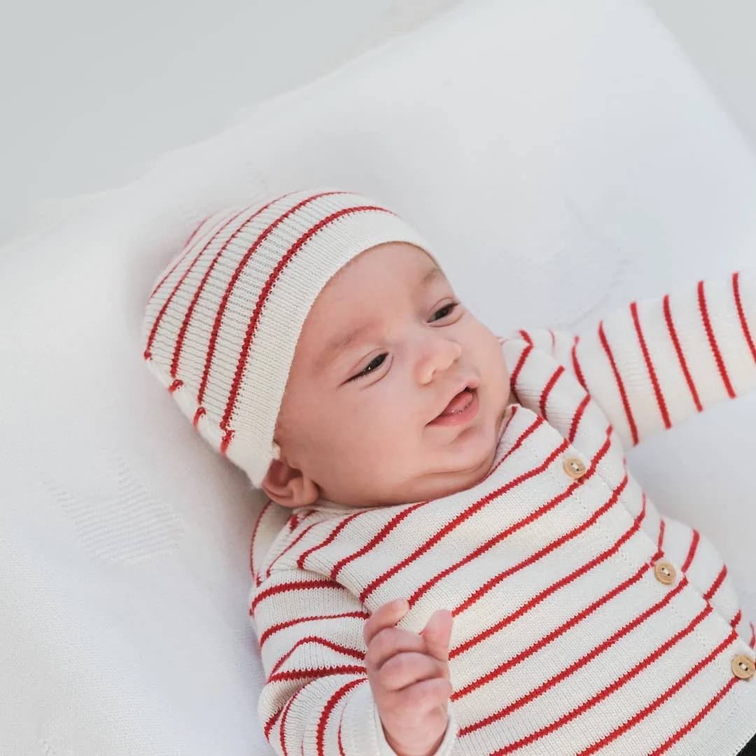 Gardez votre bébé au chaud avec ce très joli bonnet pour bébé tricoté en laine et acrylique. Un bonnet idéal pour bébé fille ou garçon, qui lui donnera un vrai petit look de marin. Ce bonnet est tricoté et fabriqué directement par nos couturières dans notre atelier de Pau, au pied des Pyrénées.