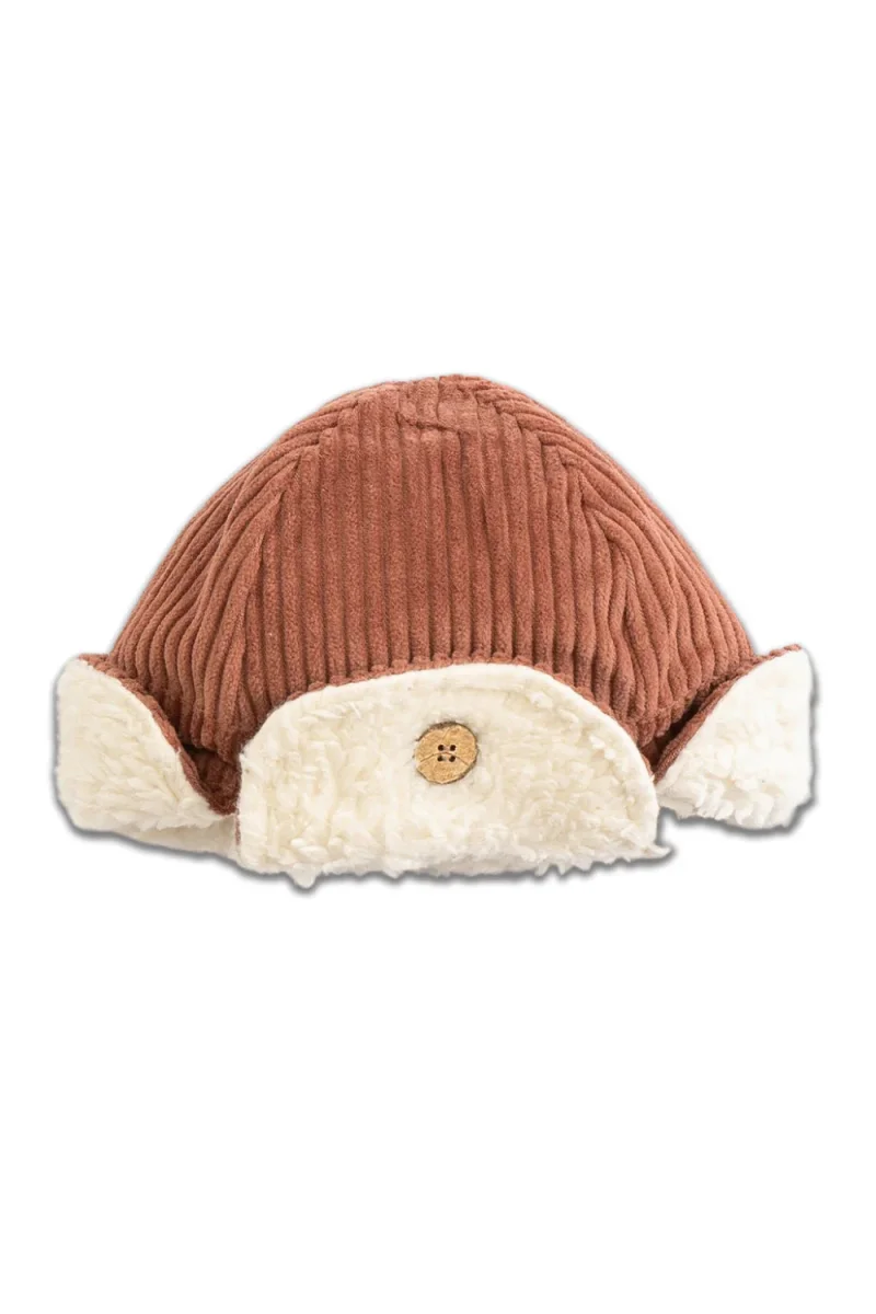 Ce chapeau est fabriqué en coton bio tissé. Ce modèle est cousu en points de jersey à l’intérieur, et propose un pare-soleil doublé de fourrure ainsi qu’un bouton décoratif en noix de coco.