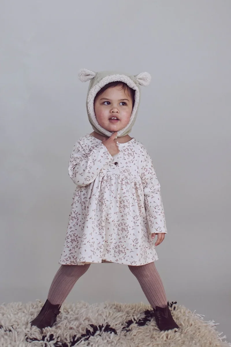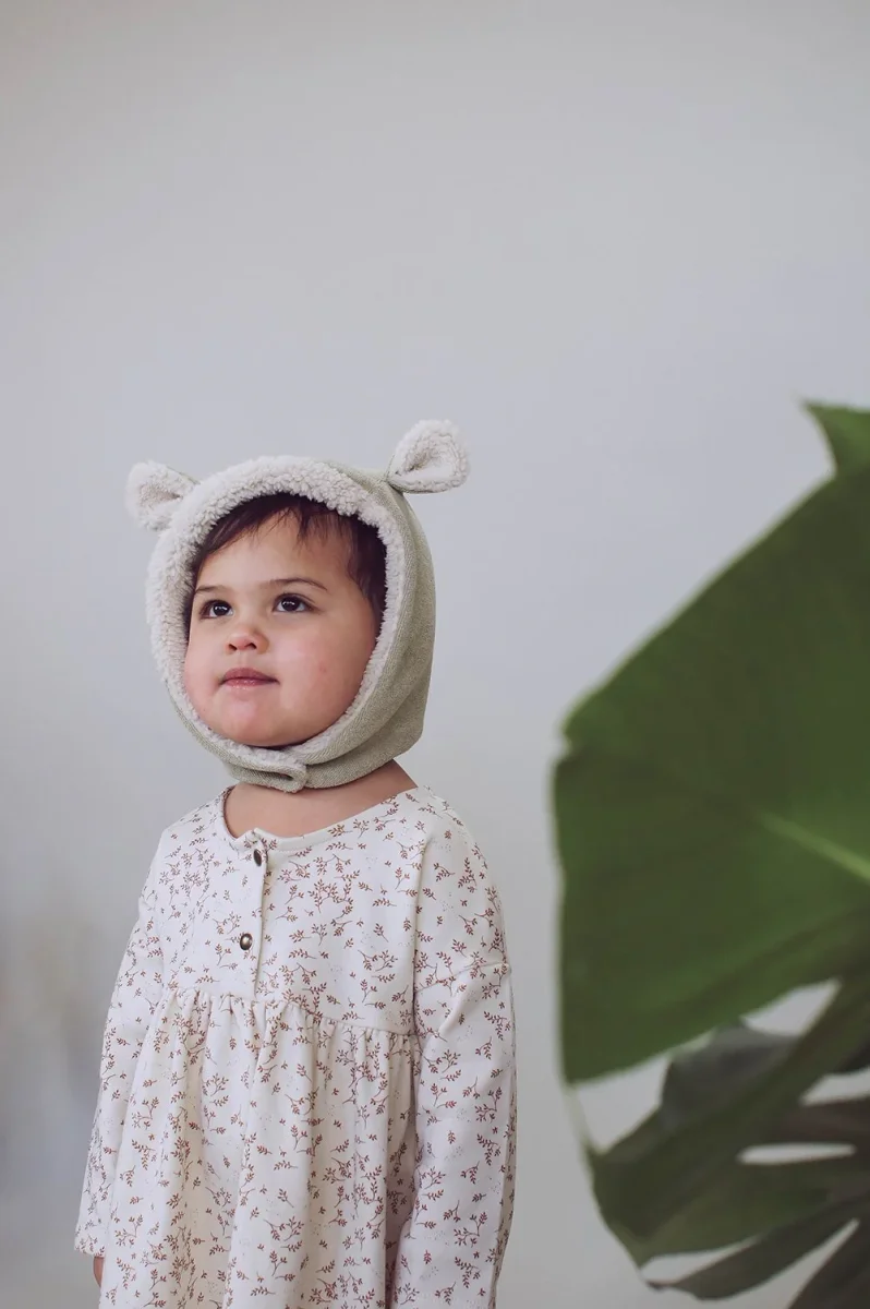 Le petit +: il tient bien en place grâce à son bouton pression sous le menton, pratique pour les bébés qui arrachent leur bonnet